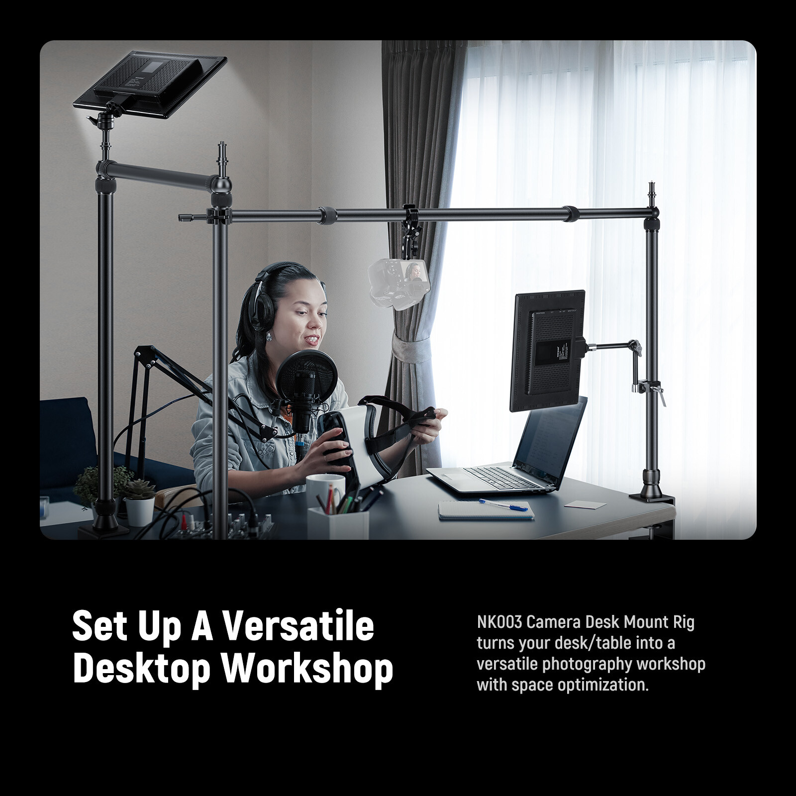 Featuring multiple mounting points, a dual ball head super clamp, and a phone holder, NEEWER NK003 overhead camera rig provides incredible flexibility to customize your desktop photography workshop. Made of premium aluminum alloy, this versatile desktop camera mount is reliable for overhead shooting. Quick and easy installment. Clamp the desktop stands, attach the crossbars, and adjust to your preferred height and width. Tightly mount the dual head super clamp to the crossbar with a hand tighten knob. In addition, the precise scale markings on the tubes ensure efficient height adjustments. Specifications Model: NK003 Item Type: Overhead Camera Mount Rig Compatibility: Camera/Webcam/Phone/LED Light Application: Live Stream/Photography/WFH Main Features: Space Saving/Versatile Mounting Points: Clamp, 5/8" stud, 1/4" screw Main Material: Aluminum Alloy, Rubber Load Capacity: Stand 26.5lb, Crossbar 13.2lb Weight: 9.4lb/4.3kg Package Contents 3 x Desktop Stand 3 x 1/4" Screw Adapter 2 x Crossbar 1 x Super Clamp with Dual Ball Head Magic arm 1 x Mini Ball Head 1 x Phone Clamp 1 x User Manual 【Set Up A Versatile Desktop Workshop】 NK003 Camera Desk Mount Rig turns your desk/table into a versatile photography workshop with space optimization. Includes 3 stands & 2 crossbars for tables of varied lengths or mounting above the right angled corner of the table. Features multiple mounting points, a super clamp, a phone clip for attaching diverse photography accessories and equipment, ideal for live streaming, still life photography, unboxing reviews, WFH, photography lighting, etc. 【For Professional Overhead Shots】 It’s a reliable overhead camera rig for top down and flat lay photography. Each stand has an adapter with a 5/8" stud and a 1/4" screw for attaching a photography accessory or device at the top. The crossbars can hang a camera or phone via the included super clamp and phone clip. The height adjustable stands (27.2" to 48.0"/69cm to 122cm) and length adjustable crossbars (25.2" to 47.2"/64cm to 120cm) provide flexible layouts for customized overhead shots 【Flexible Dual Ball Head Super Clamp】 The flexible 360° rotatable dual ball heads can be adjusted to any angle for any overhead shooting views, and the super clamp on the other end tightly mount to the crossbar with a hand tighten knob. With 1/4" threads, 3/8" threads, locating points and a built in cold shoe mount, the super clamp and magic arm can attach accessories like a phone holder (included), monitor, camera cage, microphone, LED lights and more. Max Load 6.6lb (3kg) 【Camera & Phone Shooting】 This top down platform allows you to photograph with a camera or smartphone based on your need or preference. The magic arm with a 1/4" screw can attach a webcam/camera, compatible with Canon, compatible with Nikon, compatible with Sony, compatible with Logitech C920 C922 Microsoft Razer webcams. The phone holder can be adjusted from 2.2" to 3.3" (55mm to 85mm) in width, compatible with iPhone 15 Pro Max Samsung Galaxy S23 S22 Ultra, and other smartphones 【DIY to Explore More Possibilities】 Robust anodized aluminum alloy stands (max load: 26.5lb/12kg each) and crossbars (max load: 13.2lb/6kg each) enable you to attach other mounting accessories and telescopic crossarms for more creative and professional shots, such as NEEWER ST83, ST80, ST81, ST25C, PS006, UA023, UA014, UA013, DS001, and CR221A (all not included). Every stand comes with a 2.6" (6.5cm) wide nonslip rubber padded C clamp for stable mounting without scratching your desktop