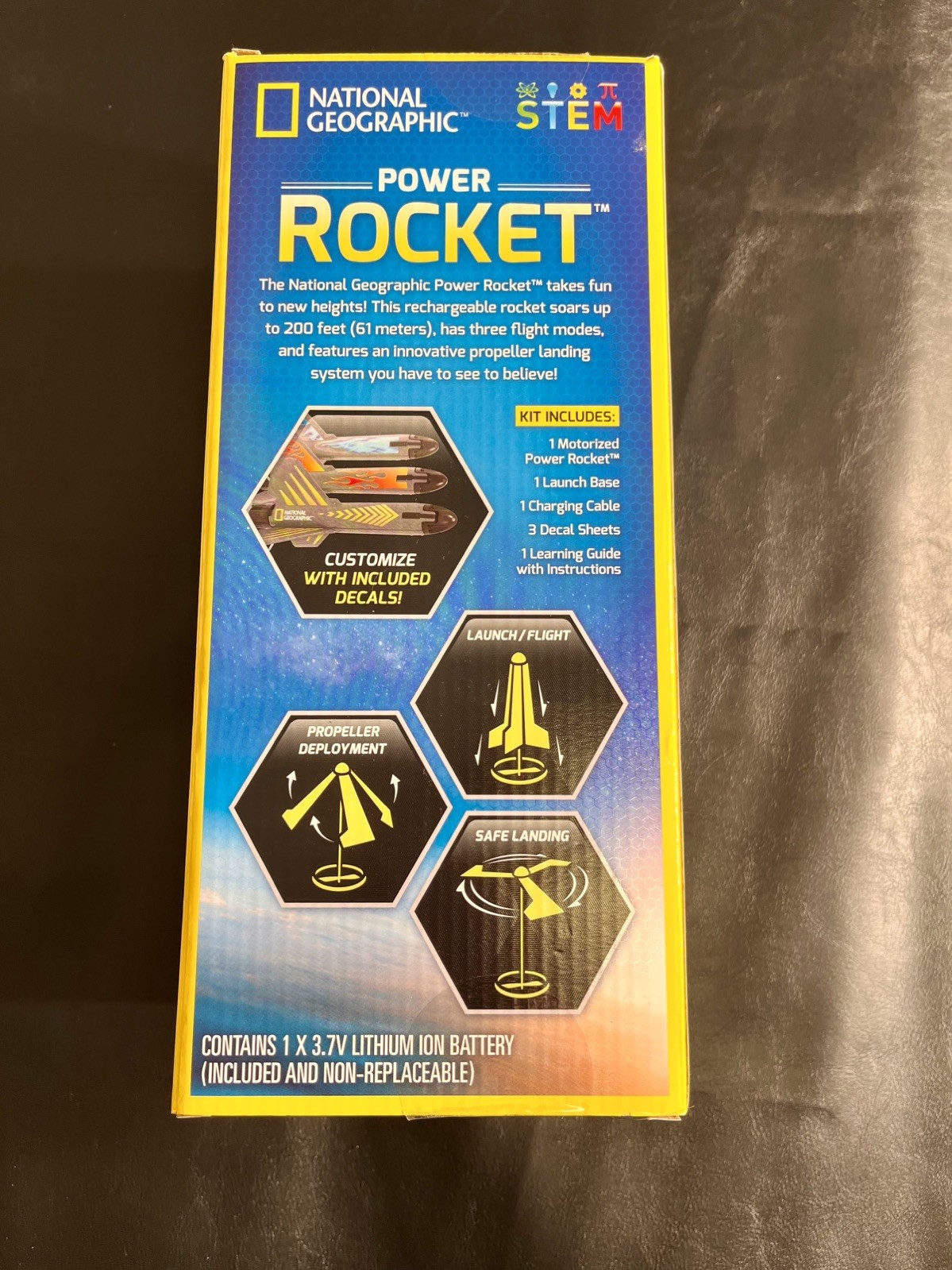 The National Geographic Power Rocket Set is an exciting toy that can soar up to 200 feet in the air! This reusable and rechargeable set is designed for kids aged 8 and up, making it a safe and fun option for outdoor play. The set includes everything needed for a successful launch, such as a power rocket, launch base, charging cable, instructions, and decals. With safe landing technology and a 3.7V lithium-ion battery included, this toy promises hours of entertainment for children of all ages. Made in China, this Power Rocket set is part of the National Geographic character family, making it a unique and exciting addition to any outdoor toy collection.