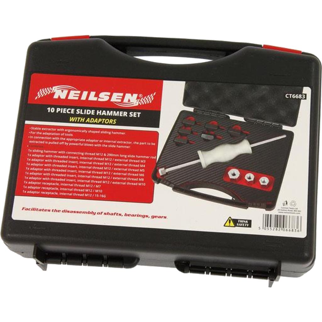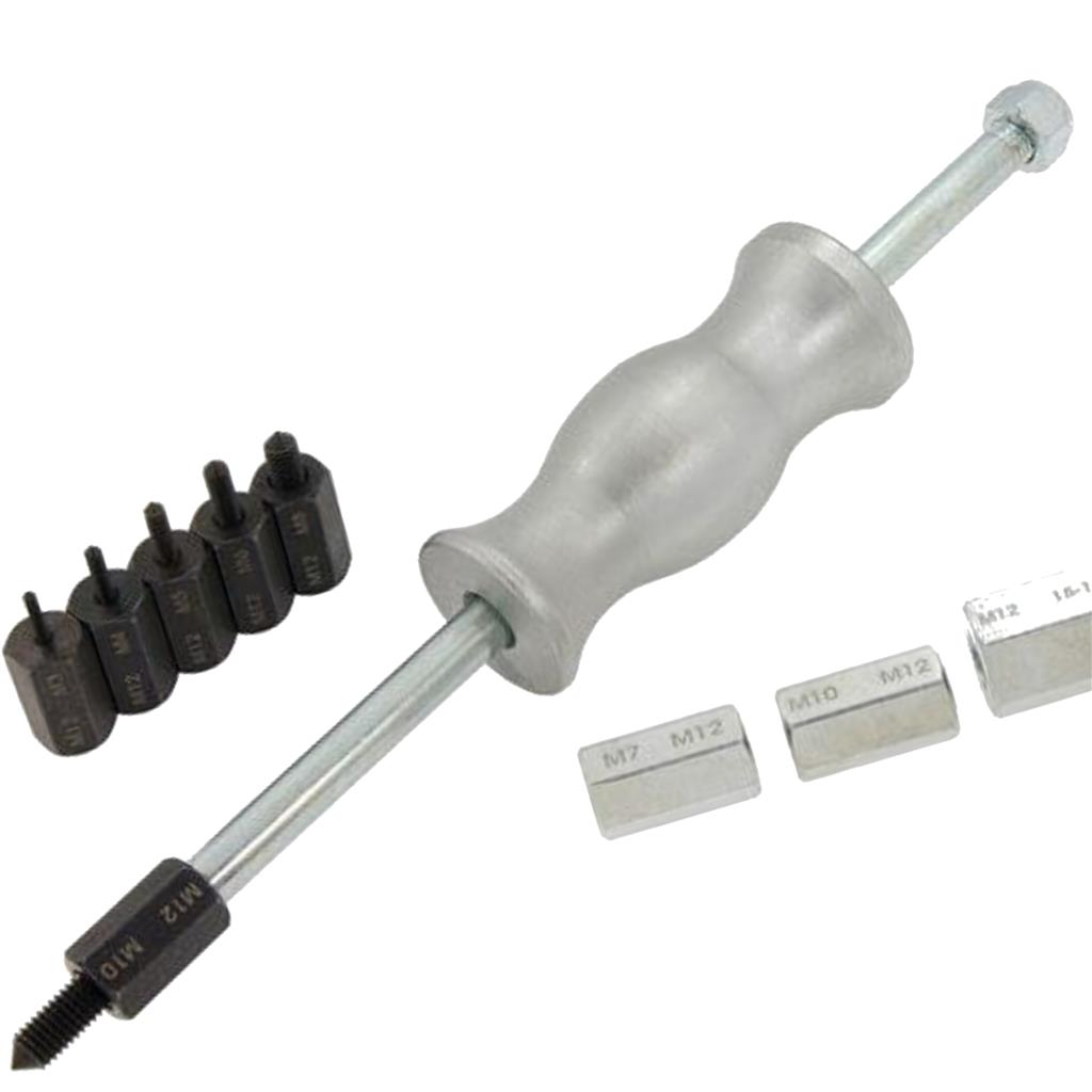 Stable extractor with ergonomically shaped sliding hammer. For the adaptation of tools. In connection with the appropriate adaptor or internal extractor, the part to be extracted is pulled off by powerful blows with the slide hammer. Contents: 1x sliding hammer with connecting thread M12 290mm long slide hammer rod 1x adaptor with threaded insert, internal thread M12 / external thread M3 1x adaptor with threaded insert, internal thread M12 / external thread M4 1x adaptor with threaded insert, internal thread M12 / external thread M5 1x adaptor with threaded insert, internal thread M12 / external thread M6 1x adaptor with threaded insert, internal thread M12 / external thread M8 1x adaptor with threaded insert, internal thread M12 / external thread M10 1x adaptor receptacle, ...