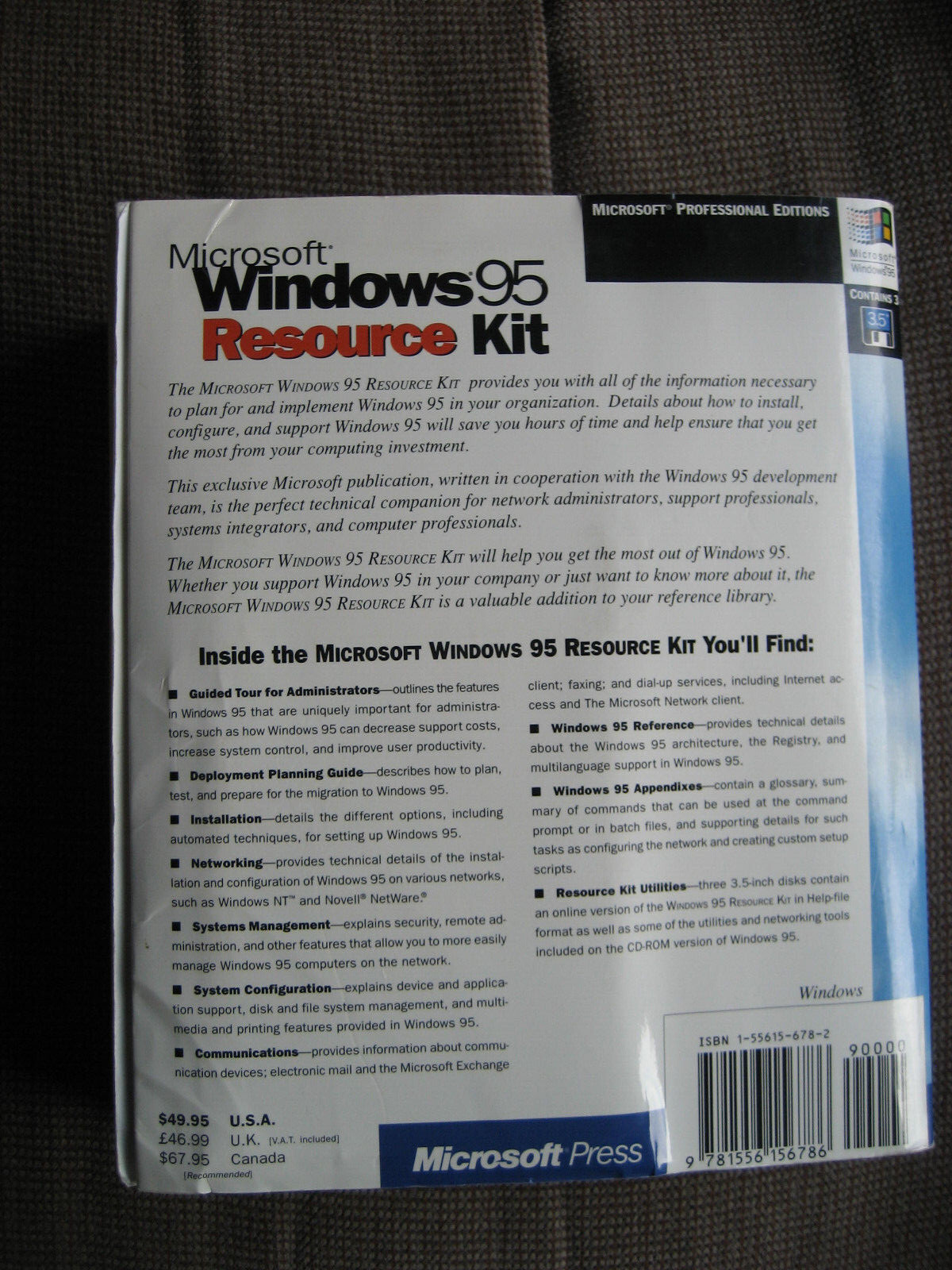 This is a "Windows 95 Resource Kit" book. It sat on a shelf for ~ 20 years and wasn't really used. It has some page crinkling from sitting on the shelf in a slanted position but is otherwise in good condition, coming with the original, unopened floppy disks. Some information is still useful today on modern Windows OSes. It is sold as is.