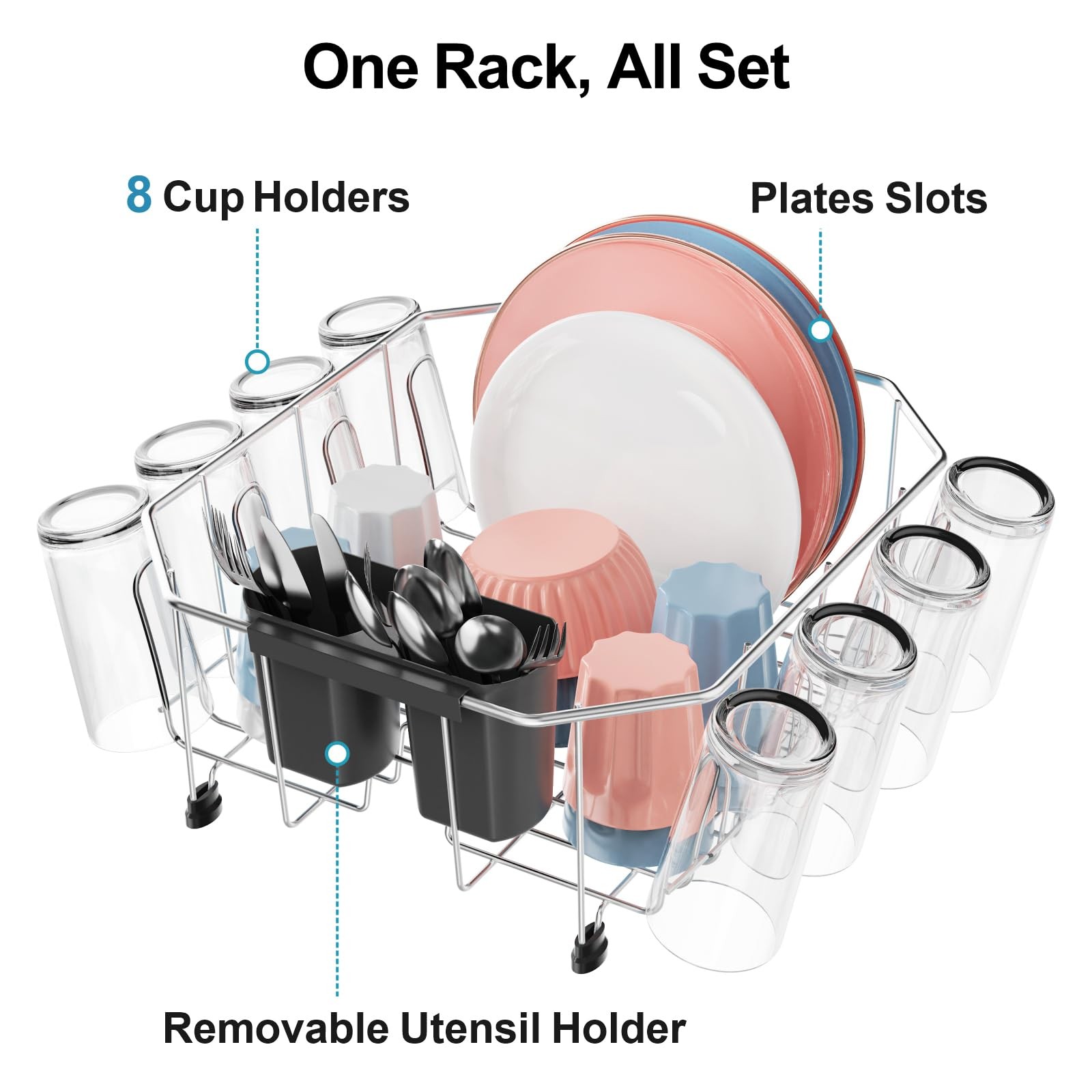 Compact Footprint with 8 Integrated Cup Hooks: Engineered for efficiency, this space-saving dish rack effortlessly holds 10 standard dinner plates, 8 cups, and daily cutlery—perfect for 1–2 person households. The 8 side hooks securely grip your mugs, instantly freeing up the main basket. Furthermore, the removable utensil caddy mounts on the shorter end, guaranteeing zero interference with your plates.
