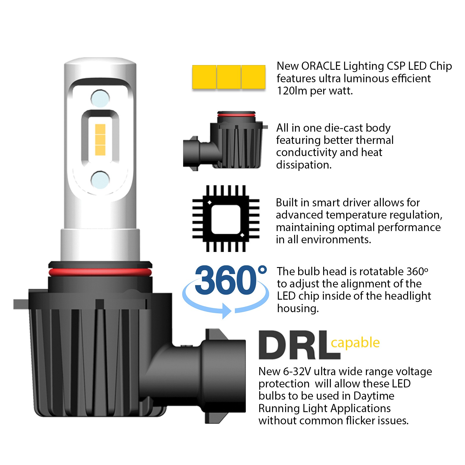 V-Series LED bulbs offer even more compatibility by working with vehicles that use the headlight bulb for the DRL function at a reduced voltage. The class-leading 6-32V ultra-wide range voltage protection will allow these LED bulbs to be used in Daytime Running Light Applications without common flicker issues. The V-Series bulb will dim to 50% brightness in DRL mode just like the factory halogen bulb.