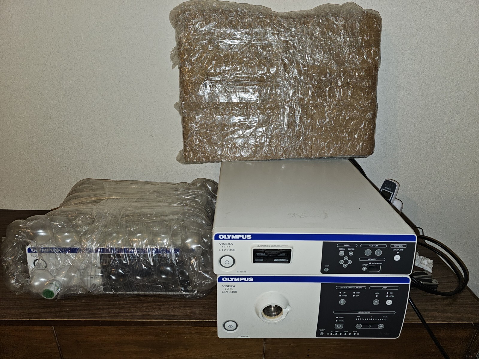 Used Olympus Visera Elite endoscopy system. The equipment includes the Olympus Visera Elite OTV-S190, The Olympus Visera Elite CLV-S190, The Olympus UHI-4, and a Sony LCD monitor. All the machines turned on, including the LCD monitor. However, the equipment has not been tested by professionals. This equipment is SOLD AS IS, WITHOUT ANY GUARANTEE OR RETURNS ACCEPTED.