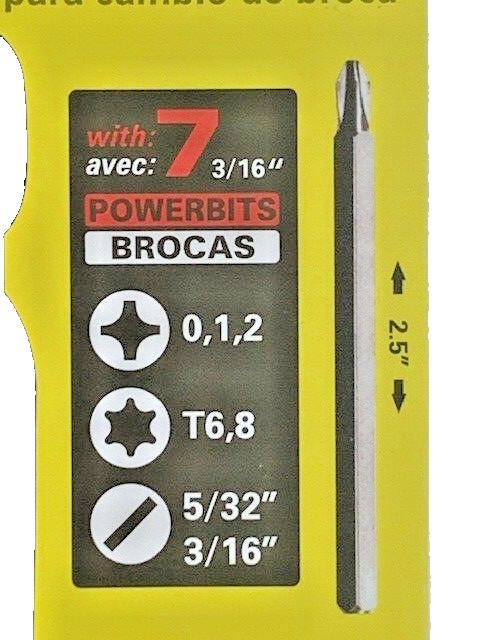 Bits included - Phillips 0, 1, 2 Torx 6, 8 Slotted 5/32", 3/16"