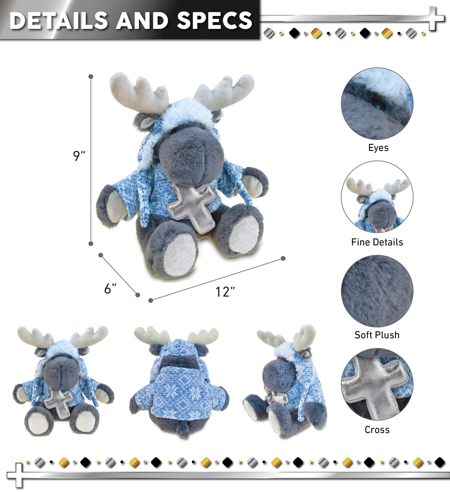 - THE MOOSE SILVER CROSS PLUSH BEAR IS FOR EVERYONE WHO LOVES SOFT STUFFED ANIMALS - The Grey Moose with Clothes stuffed animal with cross for baby girl and boy makes for sweet baptism gifts for girl and boy, as well as christening gifts. Celebrate your faith and share the passion with your loved ones by giving them cuddly small stuffed animals for kids. Metallic silver cross plush can also be presented as a healing or feel better teddy bear.