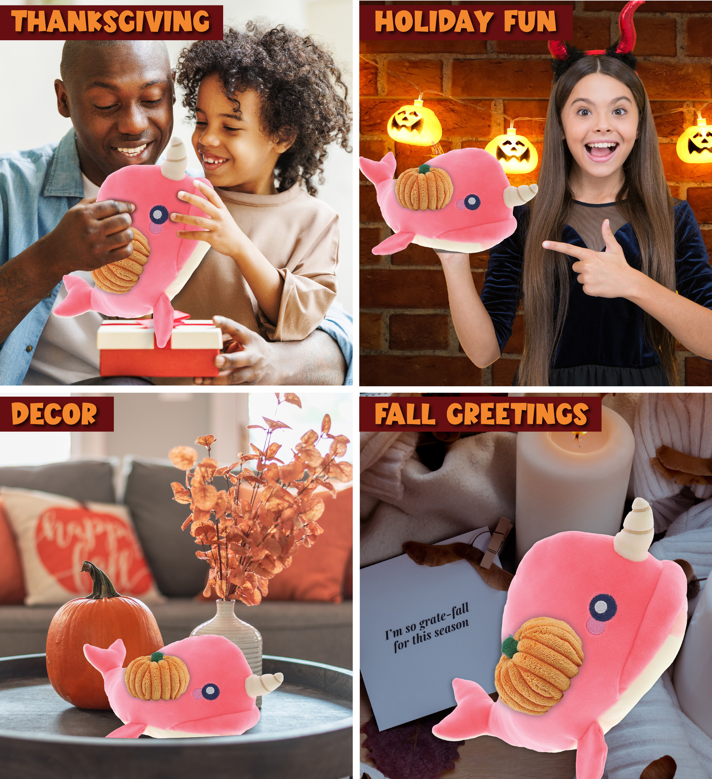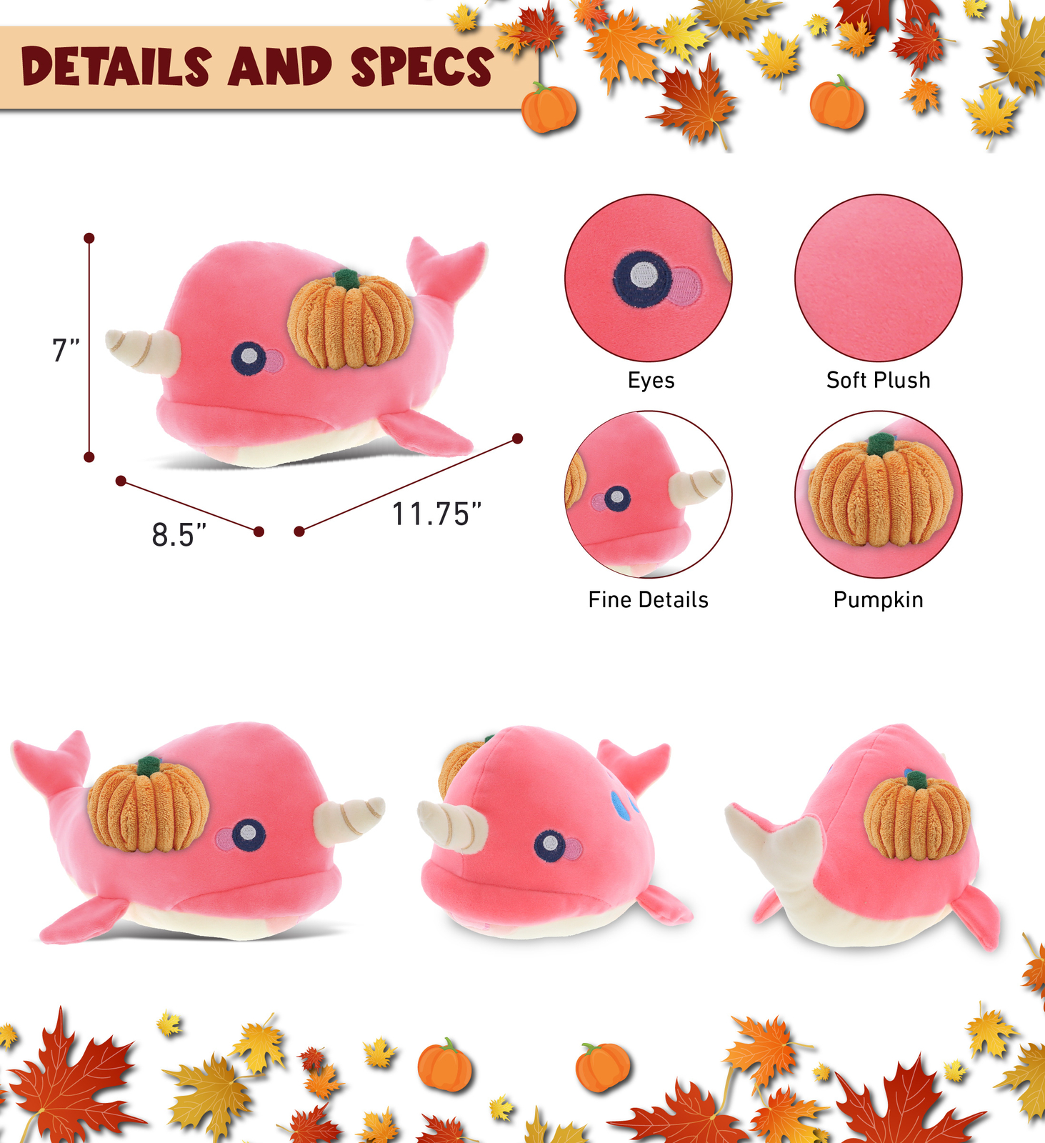 - THE PINK NARWHAL PLUSH COMES WITH UNIQUE PUMPKIN PLUSH DESIGN YOU WILL LOVE - Baby Soft Pink Narwhal Halloween stuffed animal comes with a pumpkin plush toy. Its unique design sets it apart from other soft stuffed animal. This Halloween plush combo gives a festive touch and makes any Thanksgiving fun. This Halloween stuff makes fall, Halloween and Thanksgiving meaningful. This plush pumpkin is perfect for cuddling. \n