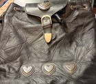 Black Shoulder Bag with Heart Accents, Drawstring & Buckle Closure, Patchwork