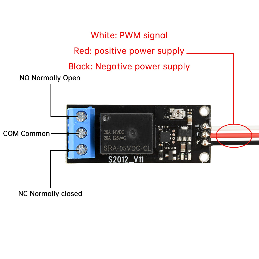 White: PWM signal line, recognizing pulse width 800us-2200us. Relay suction, PWM pulse width changes from <1300us to >1700us; vice versa close