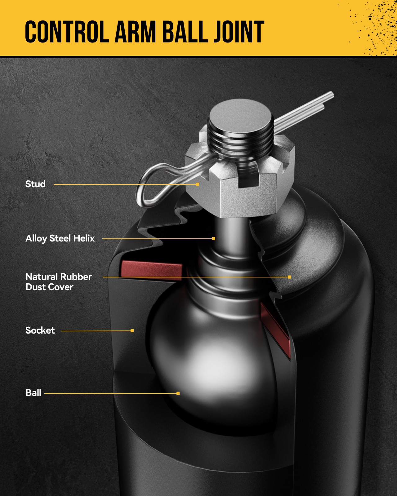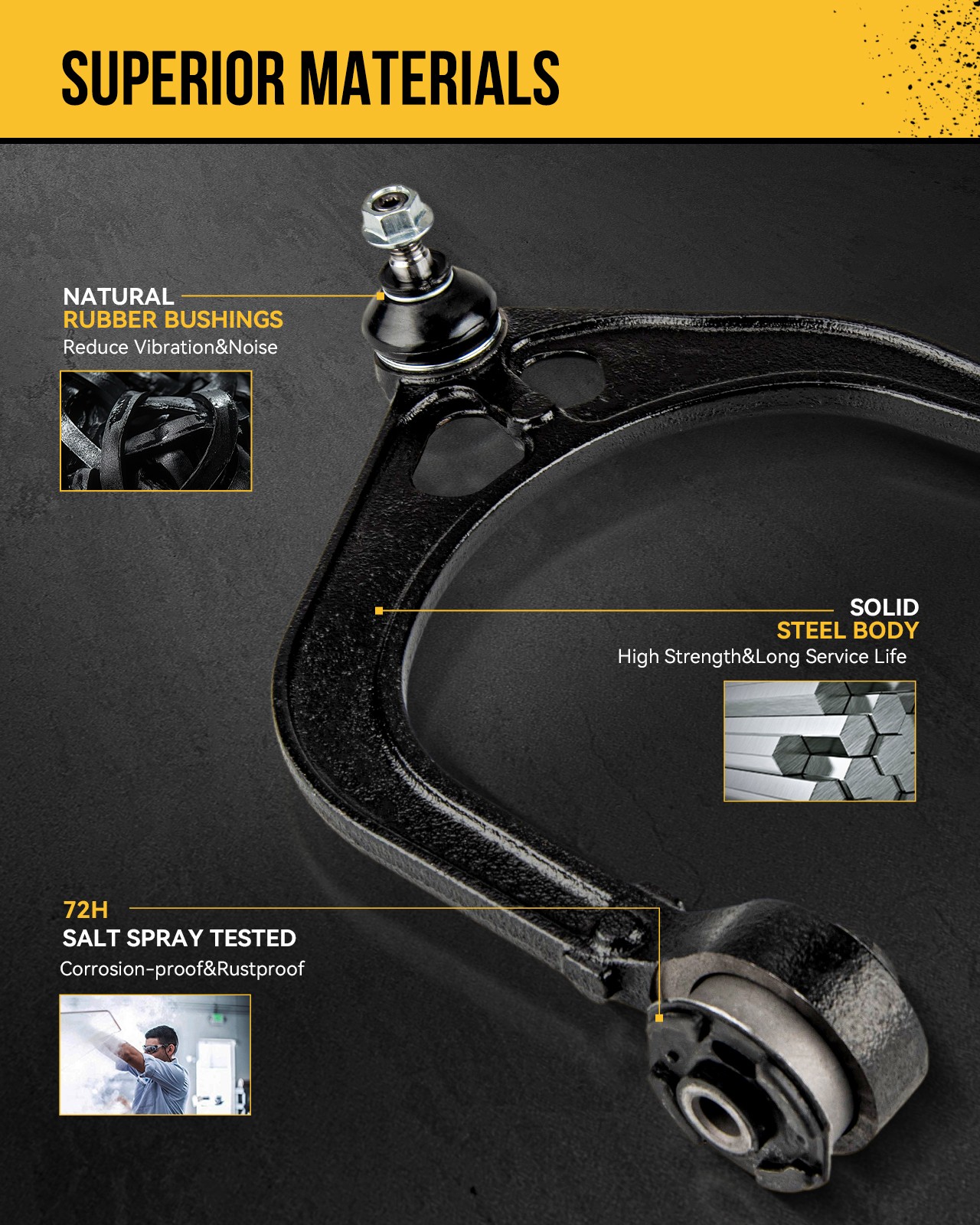 Excellent Sealing & Dust proofing To Protect Internal Components —— The control arm bushing made of natural rubber can block 99% of dust, moisture and other contaminants due to its excellent elasticity and sealing properties