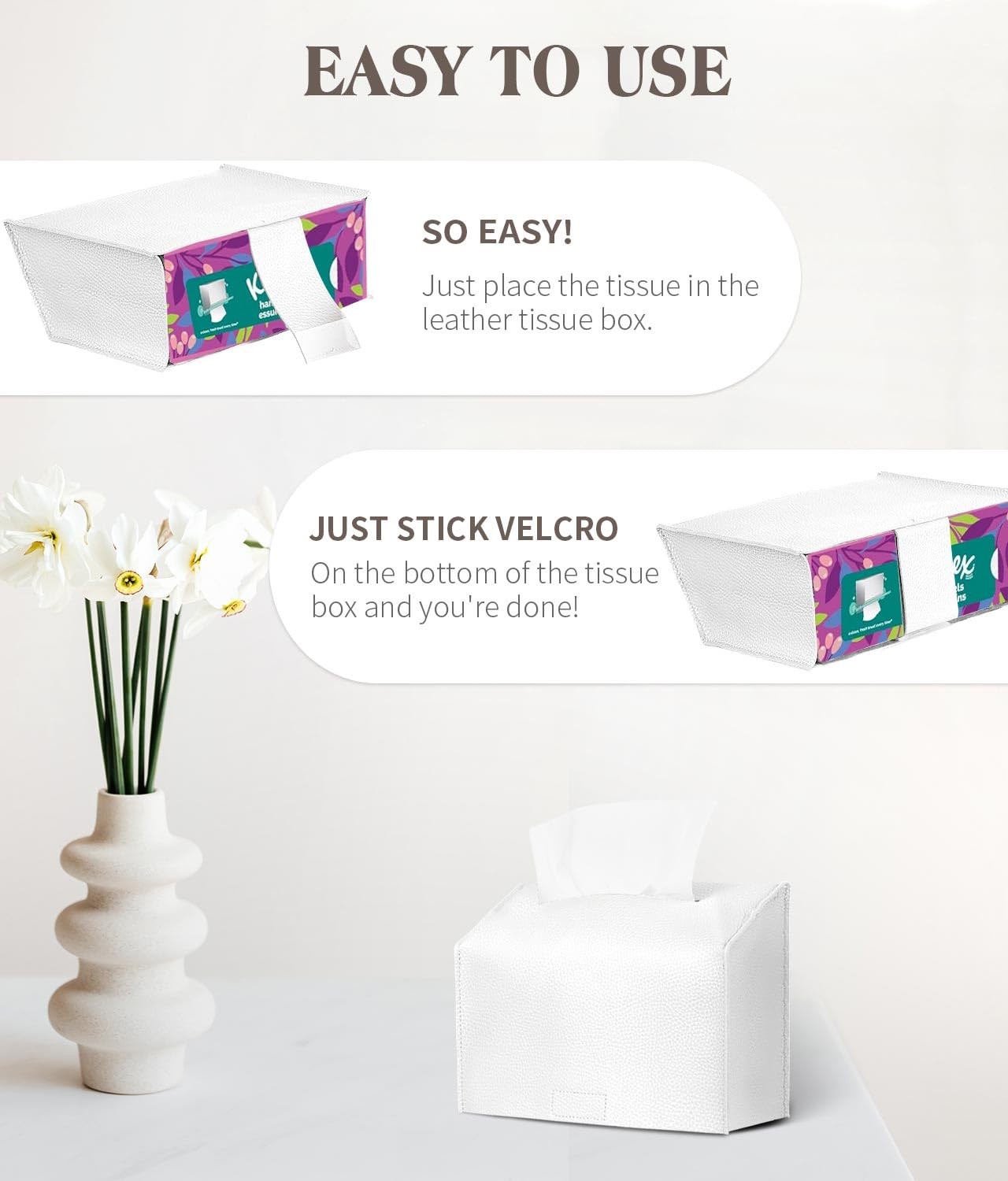 EASY TO USE: Just open the Velcro belt on the bottom for easy replacement of empty tissue boxes. Daily cleaning can be done by wiping easily with a damp cloth