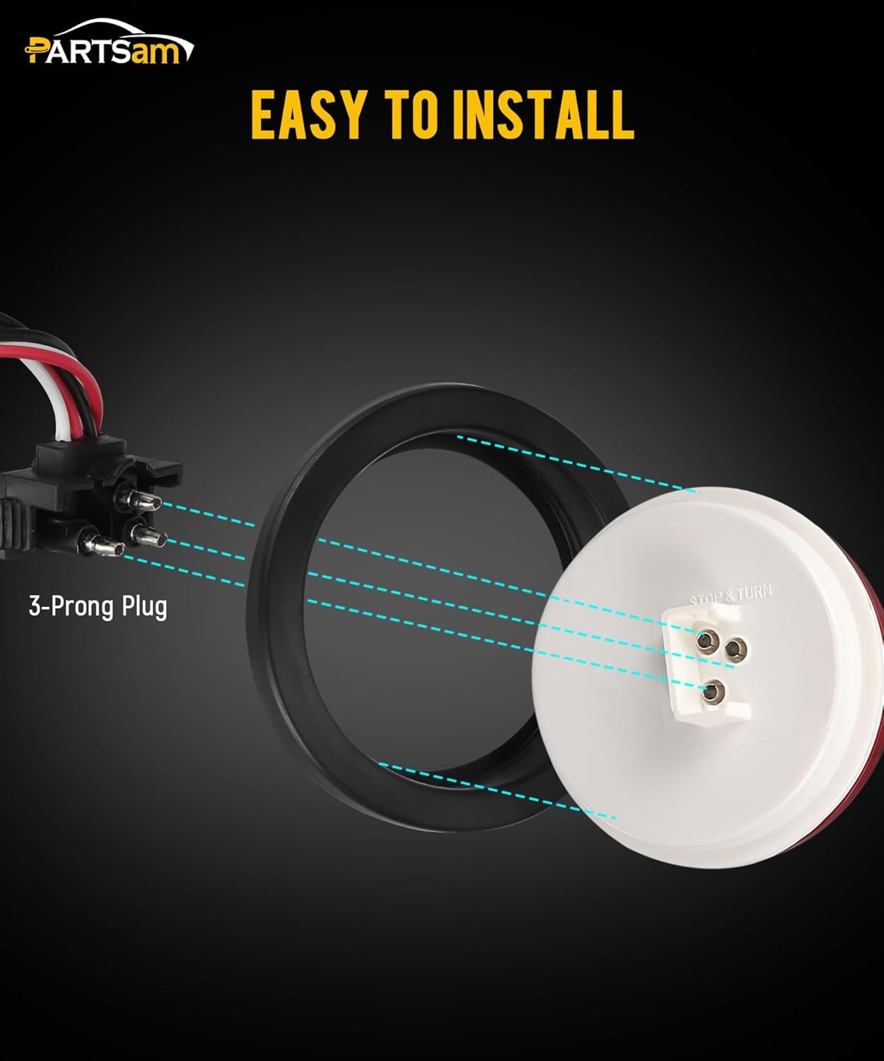 5 inch Diameter round Waterproof trailer light 12 LED serves 3 functions as stop light, turn signal light and tail light; Recessed mount with grommet and Pigtails; Accepts standard 3-prong plug; Compatible with 12V DC systems