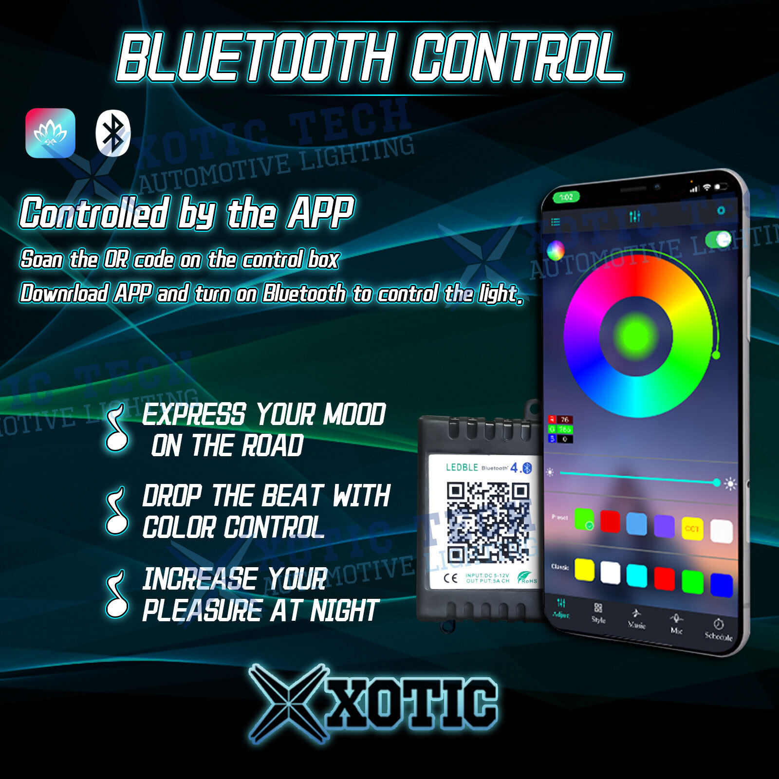 【APP Control】Soan the QR code on the control box and download APP, connect Bluetooth, no setting or network management required. Easily turn on/off, adjust color and brightness. Everything controlled by your Smartphone, Very convenient and easy operation