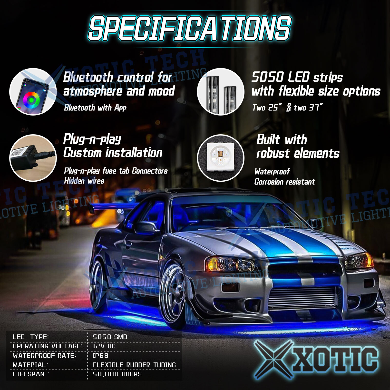 【Easy Installation】 With quick connect plugs and pre-applied adhesive tape to apply the led strips under the car.