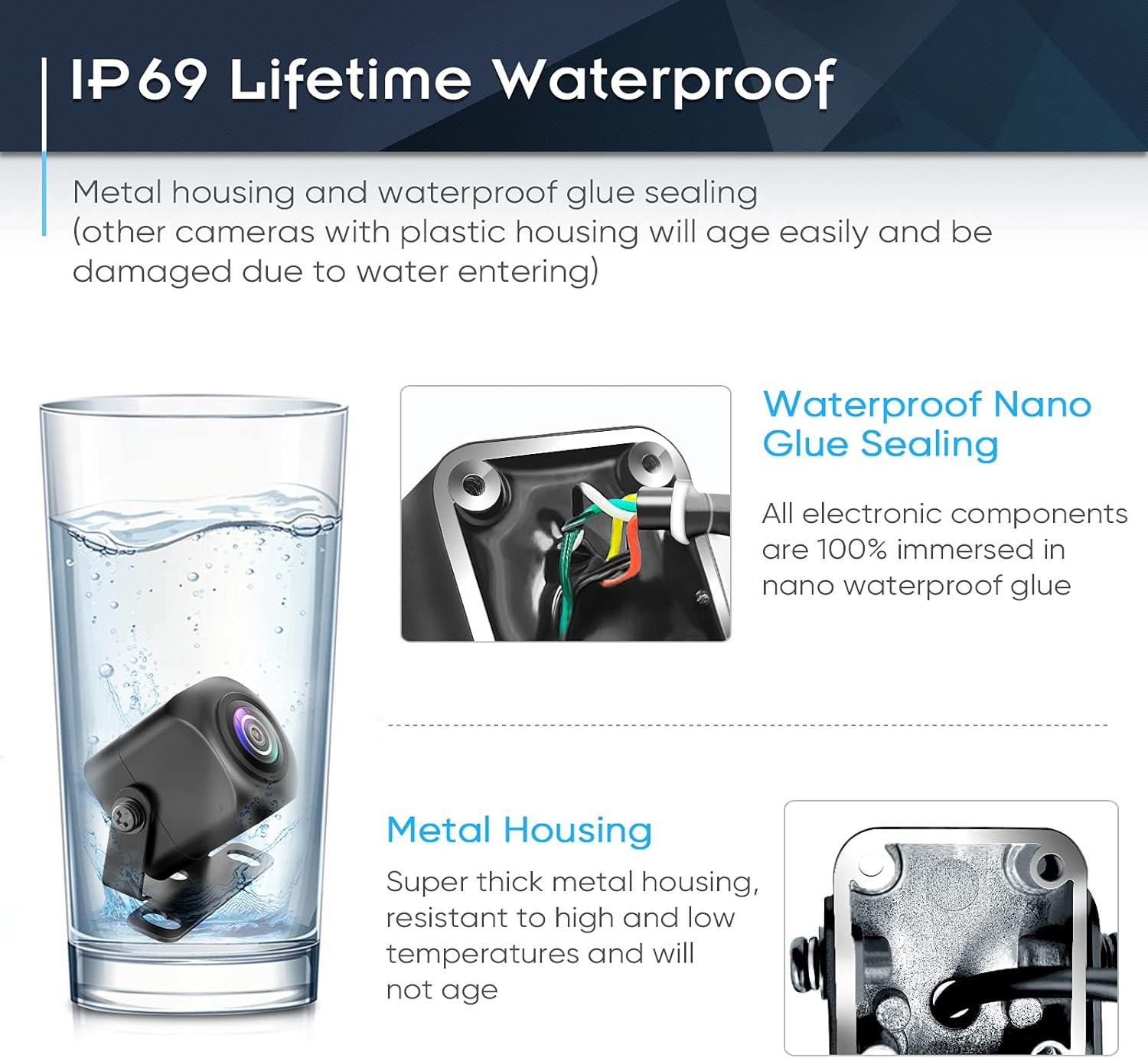 - 【IP69 Lifetime Waterproof of PixelMan PMD2A-S Rear Camera for Car】 According to the analysis of vehicle rear camera reviews, 80% of rearview cameras stop working because the plastic housing expands or contracts in different seasons, which lead to aging and water ingress. To avoid this problem, PixelMan PMD2A-S reverse camera adopts a sturdy alloy housing, together with Nano waterproof glue, ensure the internal components isolated from outside.