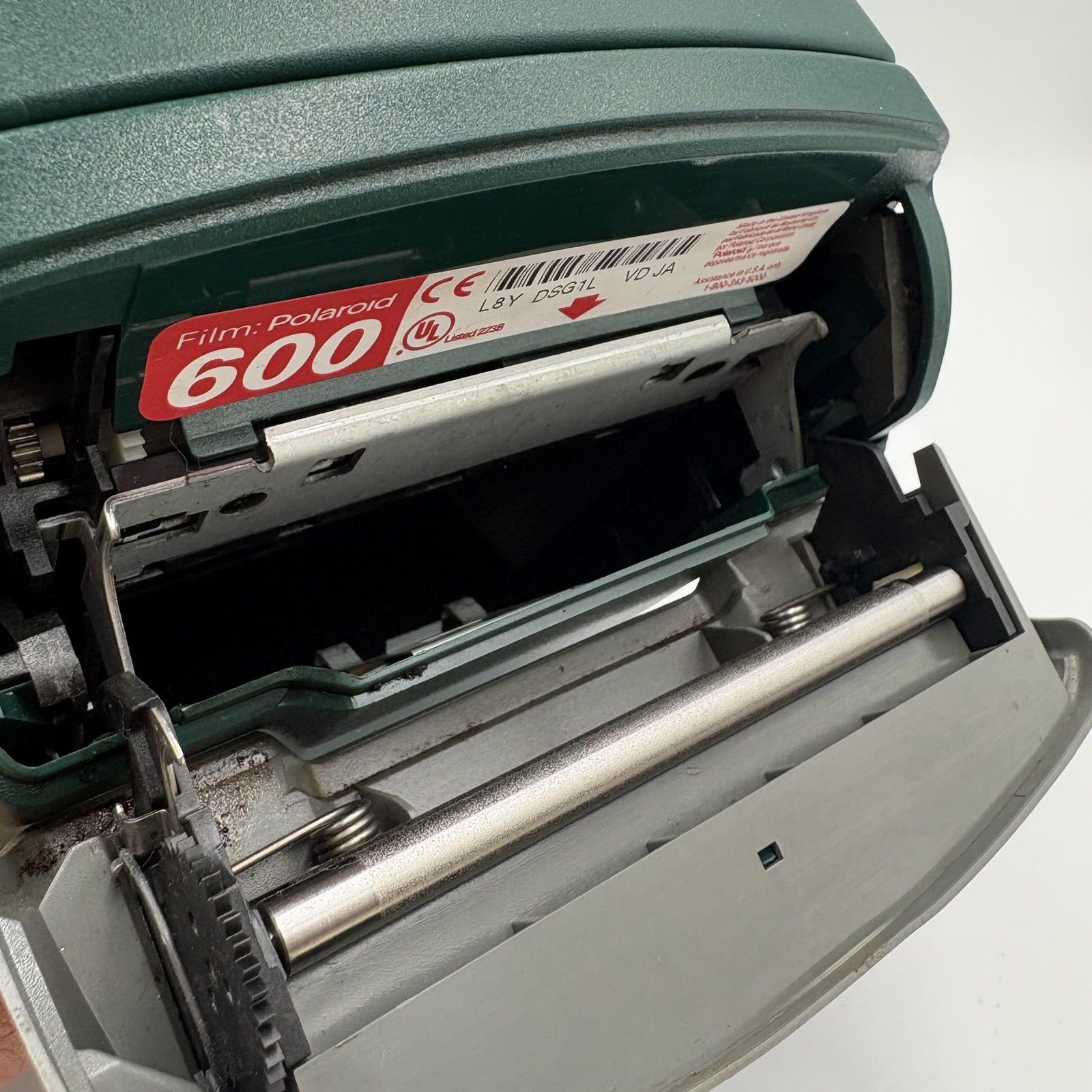 Film format: Uses Polaroid 600-series instant film packs as indicated by the interior label reading "Film: Polaroid 600" (film not included).