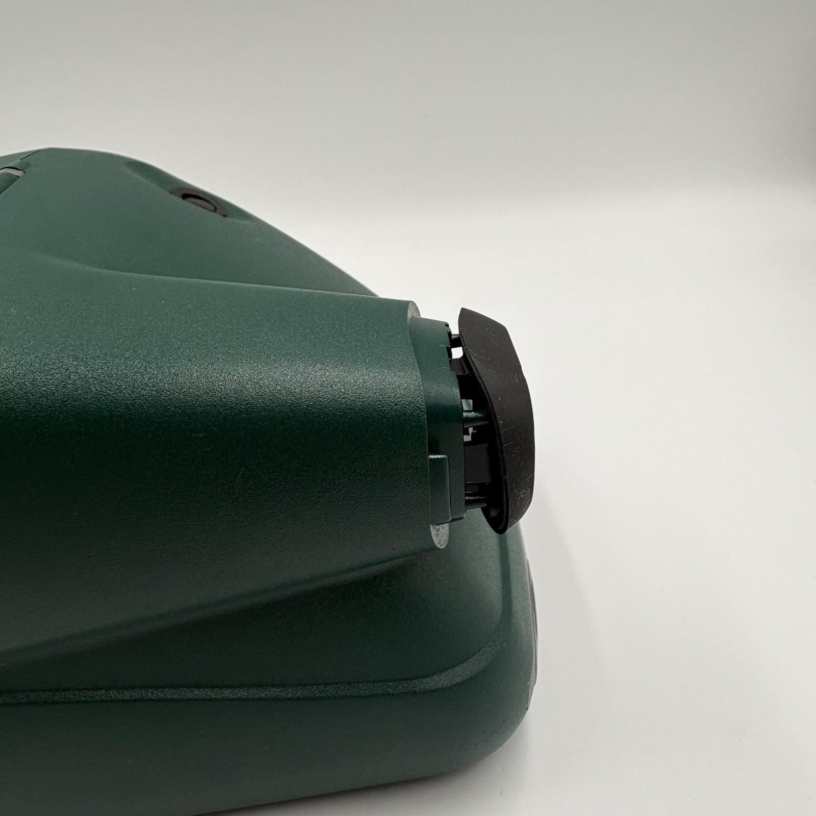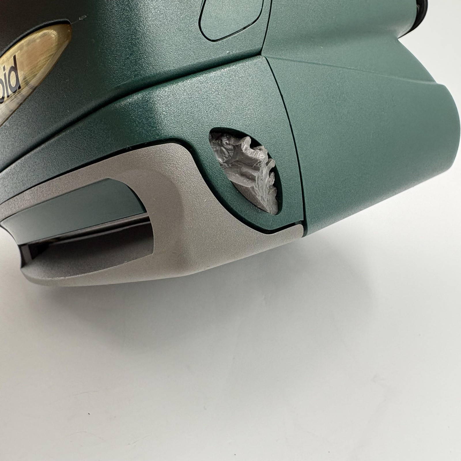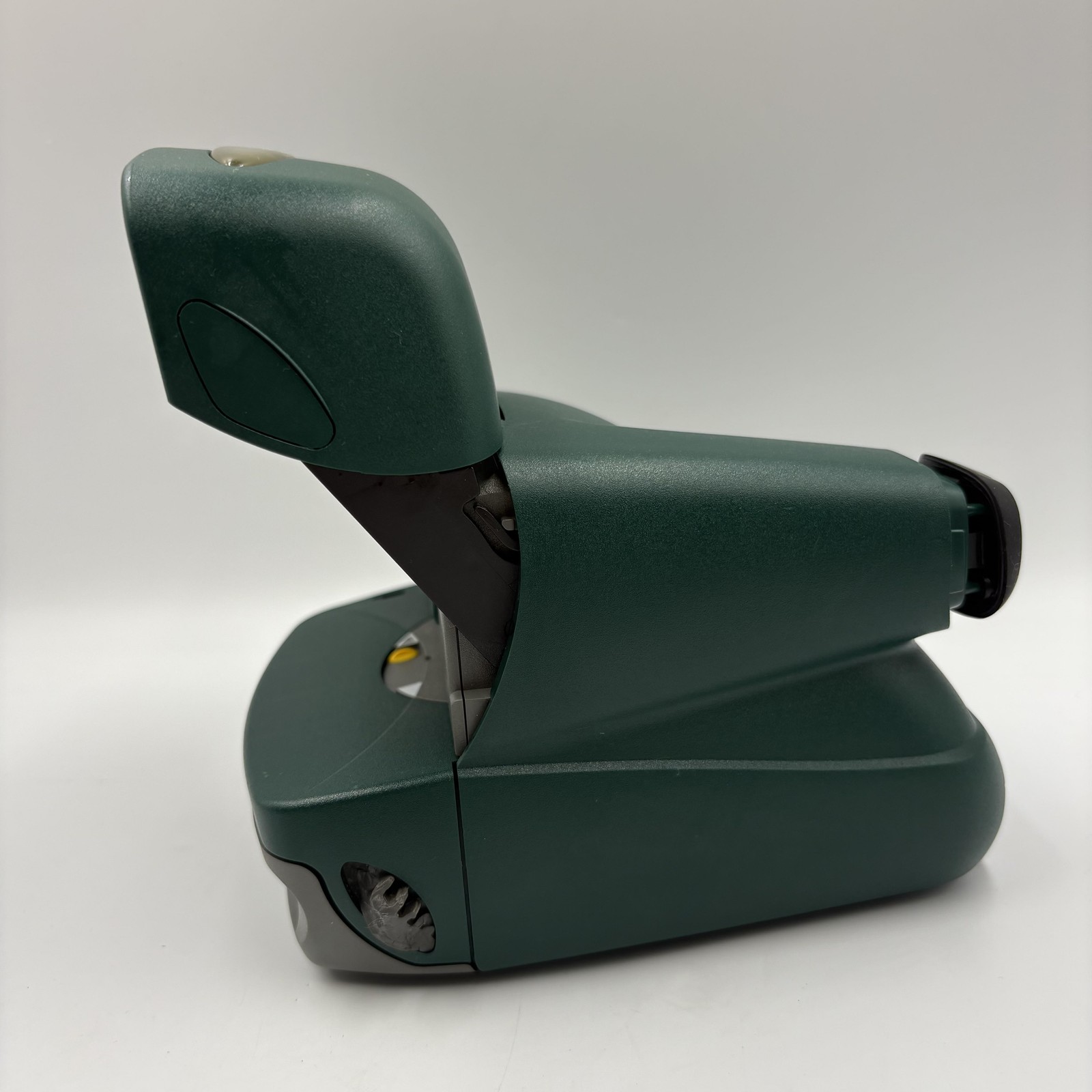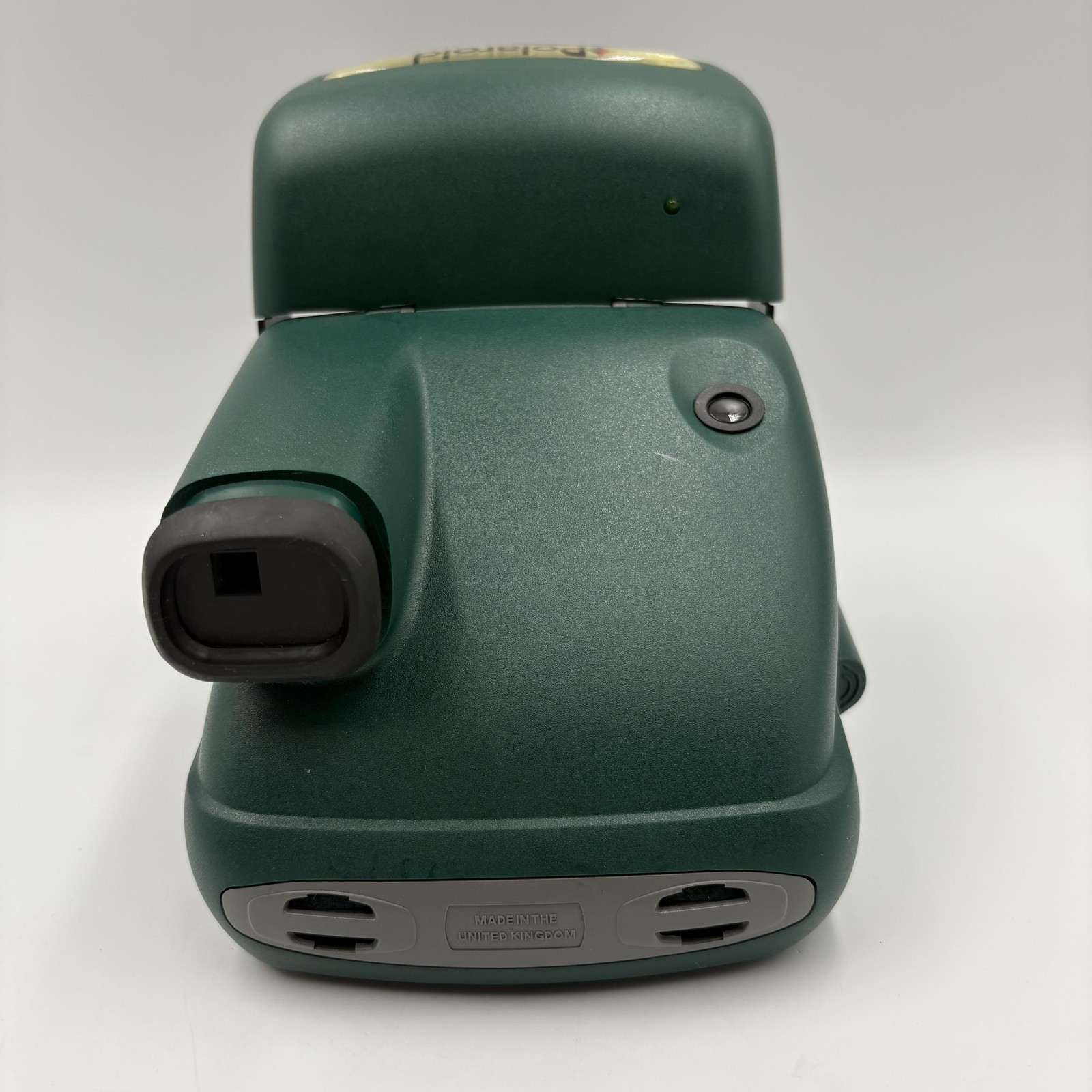 Color and design: Dark green and gray plastic body with yellow control accents and an oval Polaroid badge on the top cover.