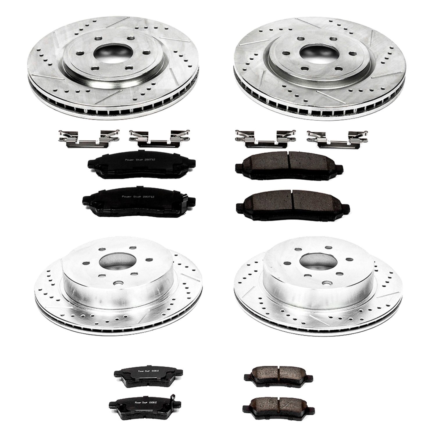 1-Click Extreme Z36 Truck and Tow Drilled and Slotted Front and Rear Brake Kit without Calipers (K144-36) by PowerStop®. This kit is the ultimate in heavy-duty braking for your vehicle. It includes slotted and cross-drilled rotors and PowerStop Z36 high-friction metallic pads. Improve your braking capability under all conditions, wet, hot, hilly, or while towing at max weight.