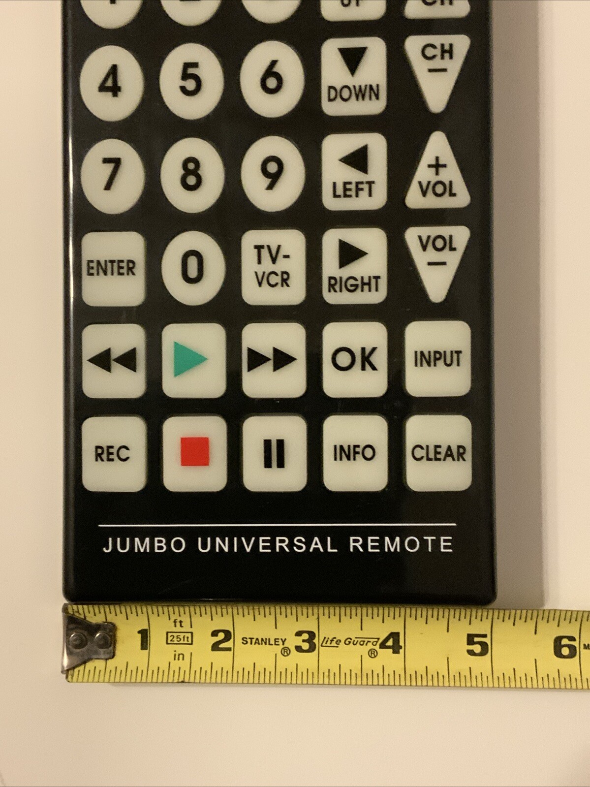 The QFX Universal Jumbo Remote Control REM-115 is a wireless remote with big buttons, designed for easy use. It has glow-in-the-dark buttons, making it convenient to use in low-light settings. With a wireless range of 5-10 meters, this universal remote is compatible with various TV, VCR, DVD, and cable brands and models. It measures 11 inches in length, 5 inches in width, and 3/4 inch in height, providing a comfortable grip for users. Ideal for those looking for a simple and user-friendly remote control solution.