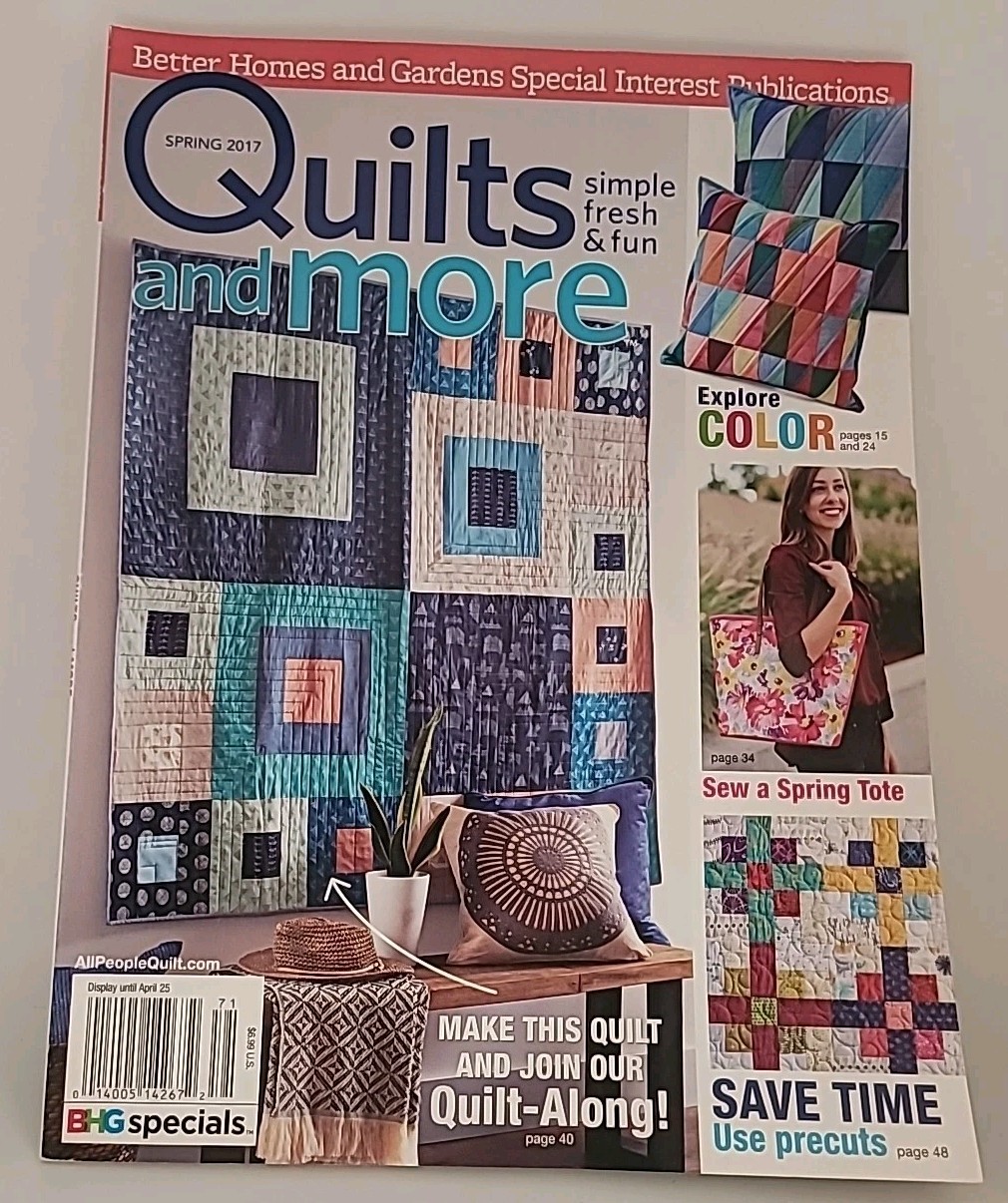 The Quilts and More Magazine BH&G 2017 Precuts Explore Color Spring Tote Patterns is a special edition publication by Better Homes & Gardens, focusing on quilting and crafts. This magazine, released in April 2017, features a variety of patterns and tutorials for quilters and crafters interested in exploring new designs and techniques. With a dust jacket and illustrated content, this English-language publication offers inspiration and ideas for art, sewing, and quilting enthusiasts in the United States.