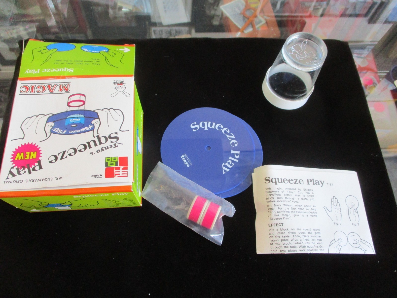 Both sides of two round plates are shown to the spectators. The cylindrical block is centered on one of the plates and placed onto the transparent glass. The other plate is placed onto the block, sandwiching it between the two plates. The block can be seen clearly through a hole in the upper plate. With both hands the magician grasps opposite sides of the plates firmly and squeezes them together. The block suddenly penetrates the lower plate and falls into the glass. Everything can be examined by the spectators.