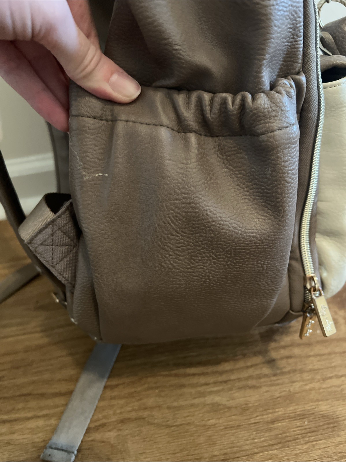 READ Itzy Ritzy Diaper Bag Backpack Vanilla Latte Mocha Large Capacity Boss Bag. Condition is fair preowned. See pictures for the flaws. There is staining on the inside and places where the leather is scuffed off on the outside. Side outside zipper is broken.