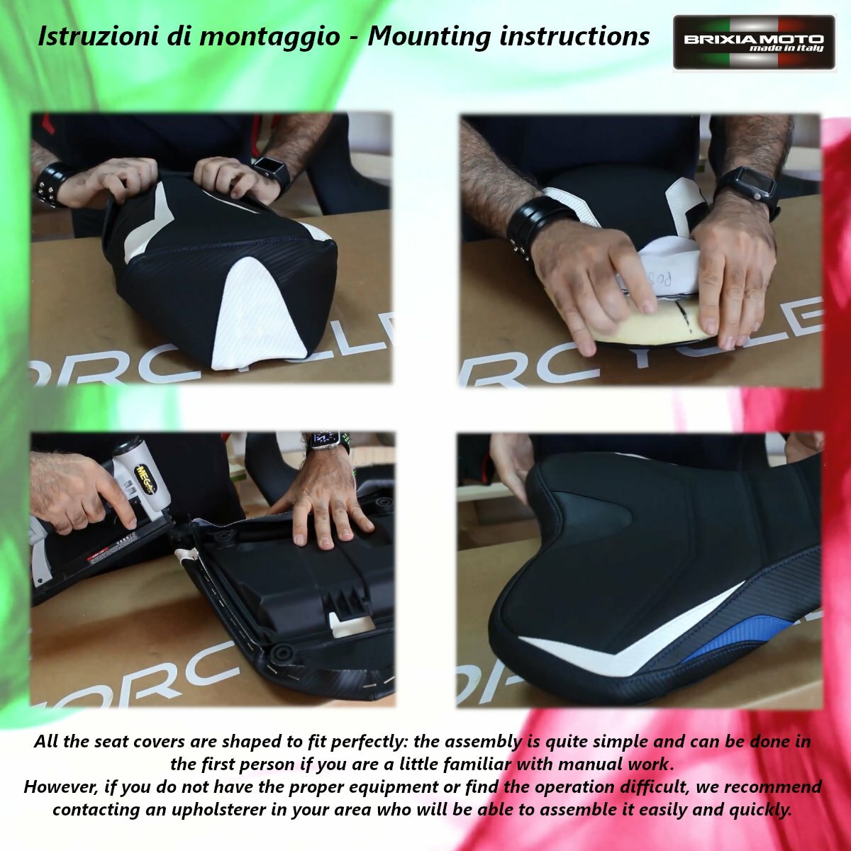 Tutti i rivestimenti sono studiati per aderire alla perfezione all'imbottitura della sella originale: lo smontaggio della copertura di serie e il conseguente montaggio del nuovo coprisella è abbastanza semplice e puo essere realizzato anche in autonomia, avendo un po' di esperienza con i lavori manuali e pochi attrezzi a disposizione (un cacciavite a punta piatta, una pinza e una pistola sparapunti sono sufficienti per la maggior parte dei casi).