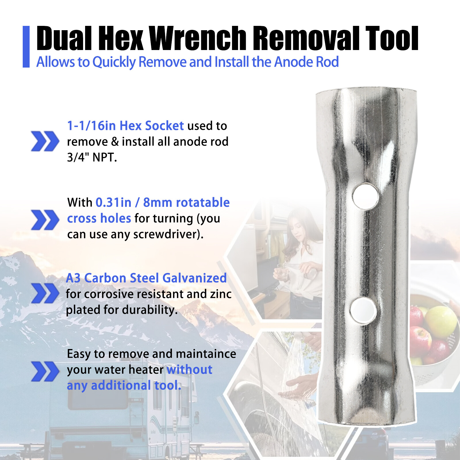 - 2 IN 1 HEX WRENCH: features A3 Carbon Steel Galvanized and non-corrosive material, high hardness and long service life. One end size 1-1/16inch hex removing all anode rod 3/4" NPT, another end measures 0.95inch hex. Can be used with a screwdriver inserted into the hole in the wrench without any additional tools.
