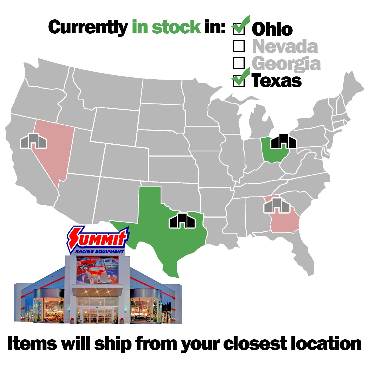 In-stock items can ship from four locations - Georgia, Nevada, Ohio, or Texas. To avoid delays, we ship the order from your nearest stocking warehouse. This means orders may arrive in multiple boxes or at different times.