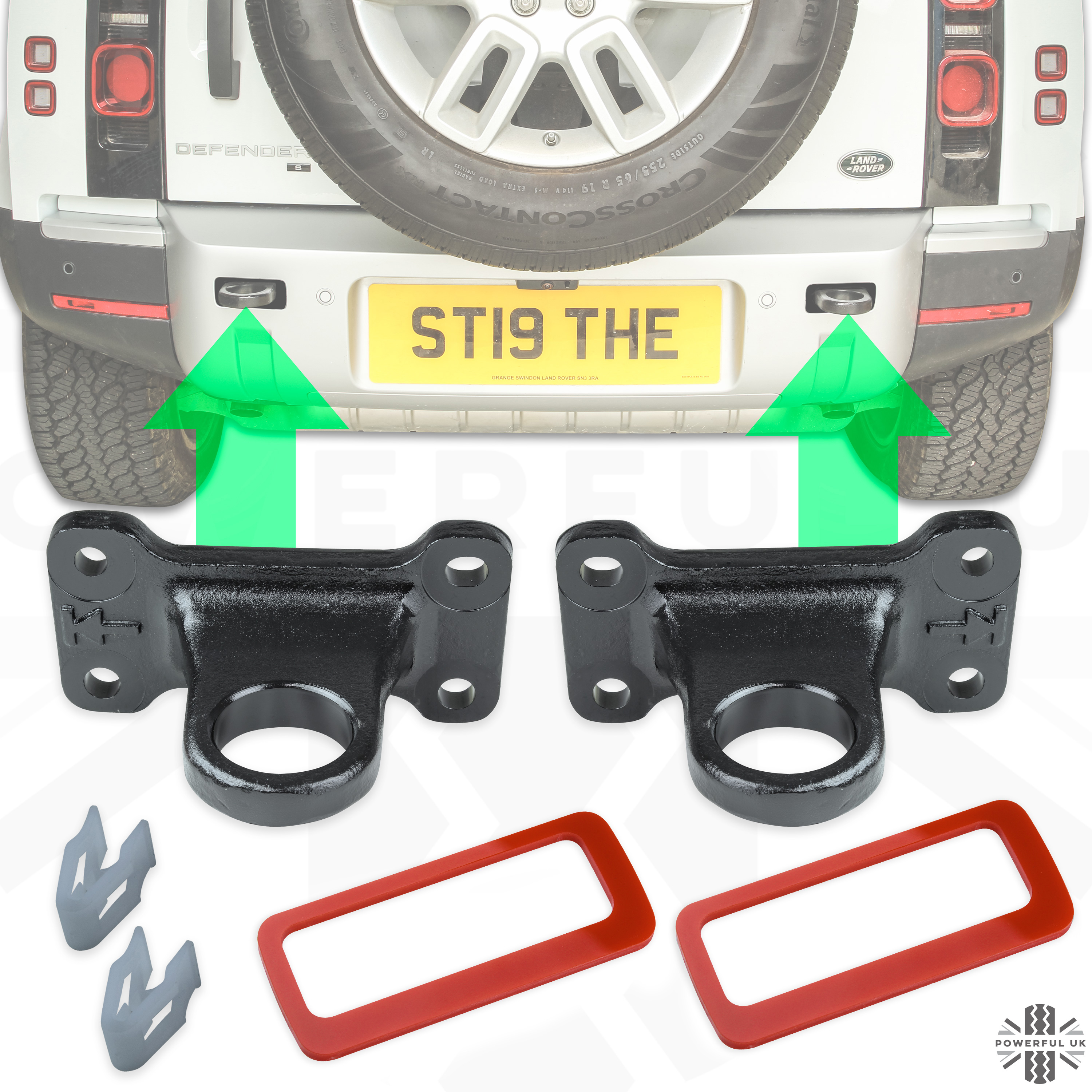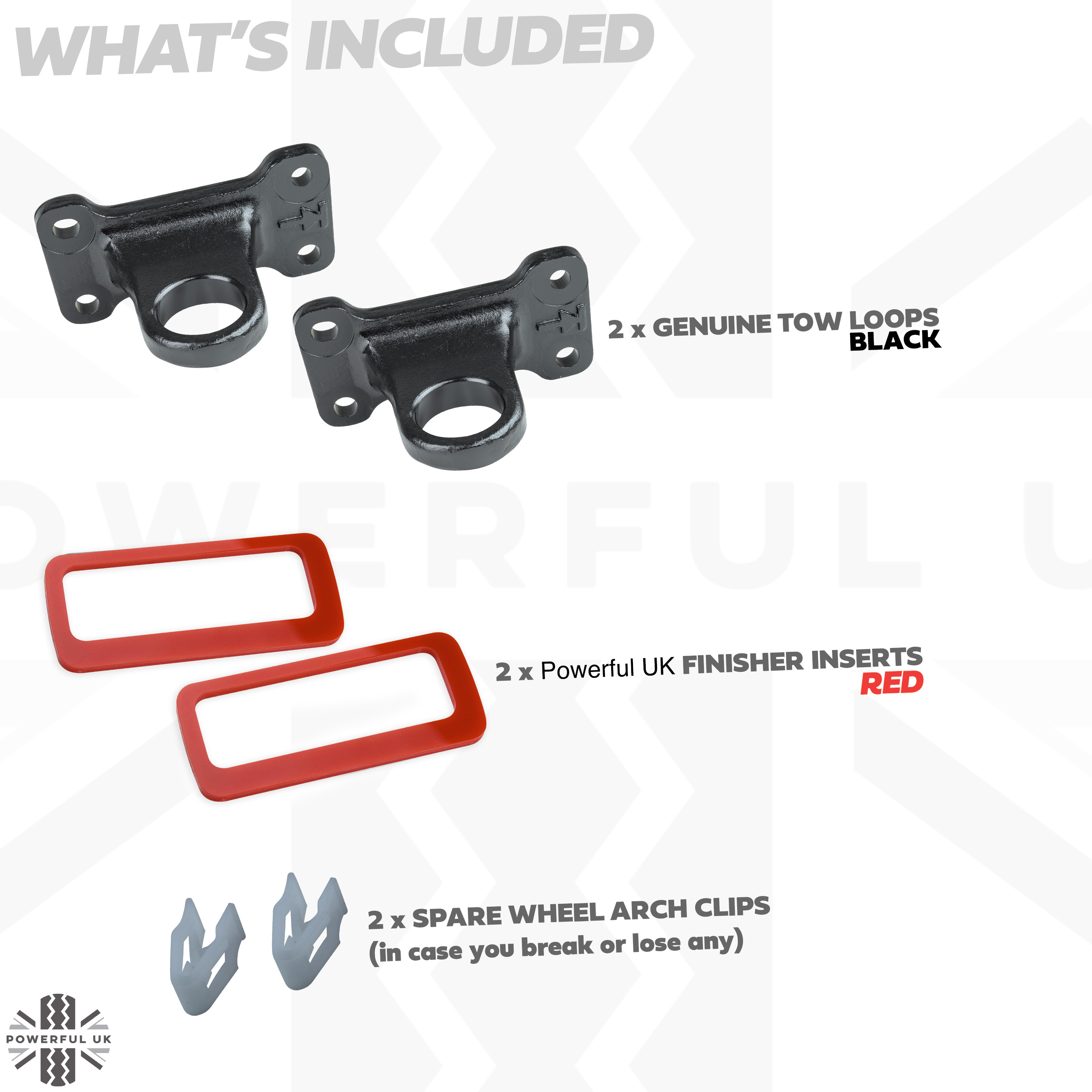 This kit contains everything you need to add these 'always ready' permanent towing loops to the rear of your Defender (you reuse the bolts that are already fitted).