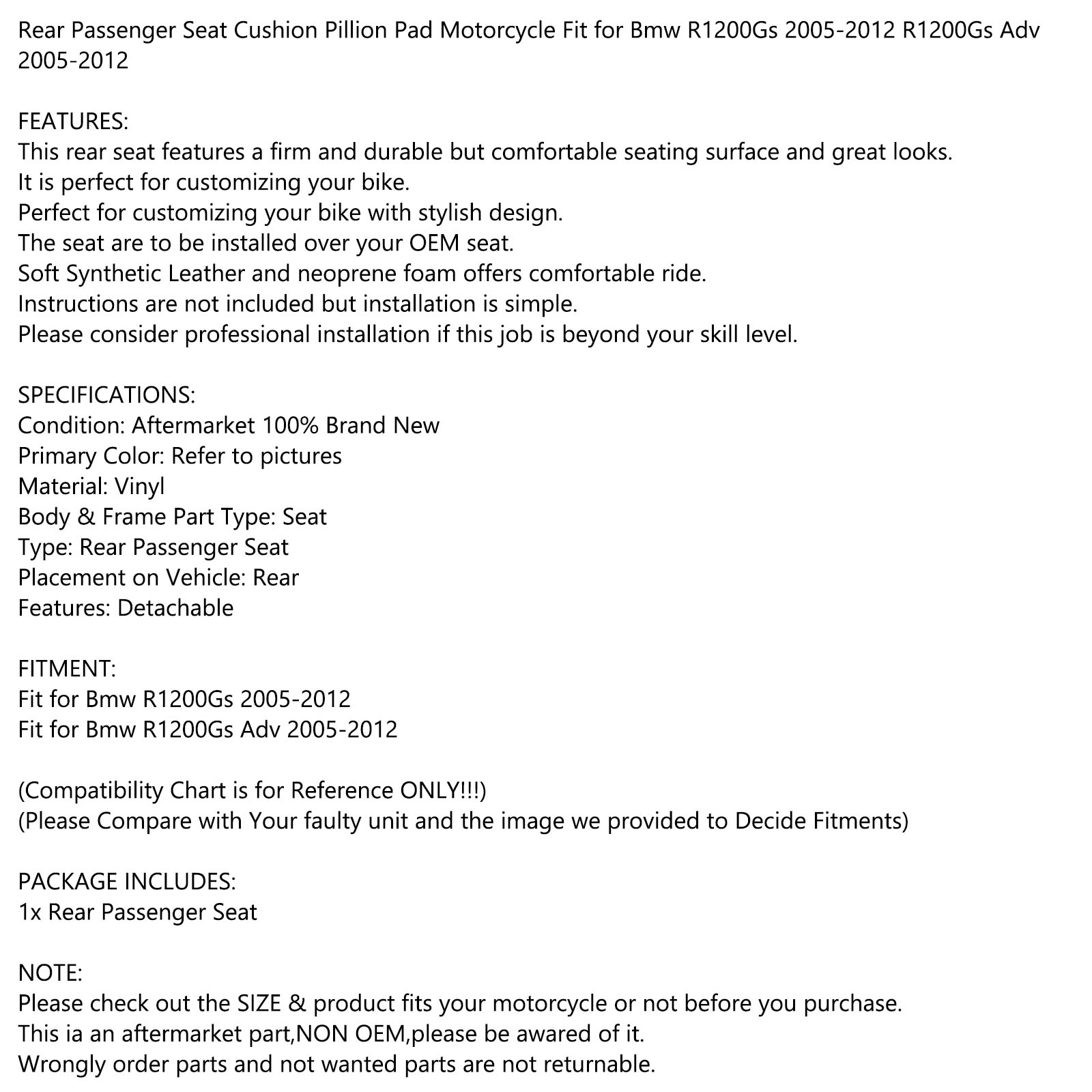 Rear Passenger Seat Cushion Pillion Pad Motorcycle Fit for Bmw R1200Gs 2005-2012 R1200Gs Adv 2005-2012