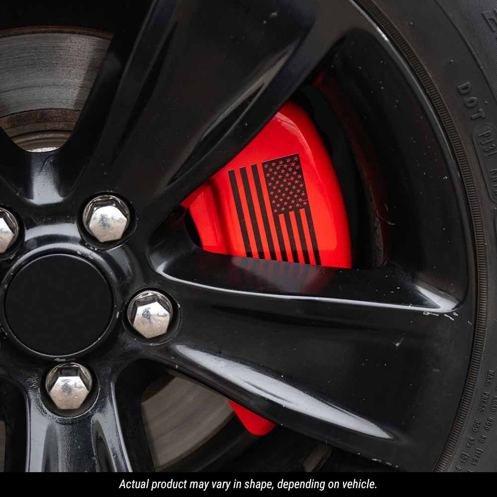 MGP Caliper Covers are a car accessory designed and manufactured specifically for your vehicle to cover up and hide those ugly brake calipers. These aluminum caliper covers are finished with a high-quality powder coat. These red caliper covers with a black U.S. flag will enhance your wheel appearance and curbside appeal. MGP Brake Caliper Covers are tested for safe fitment and are licensed by major manufacturers.