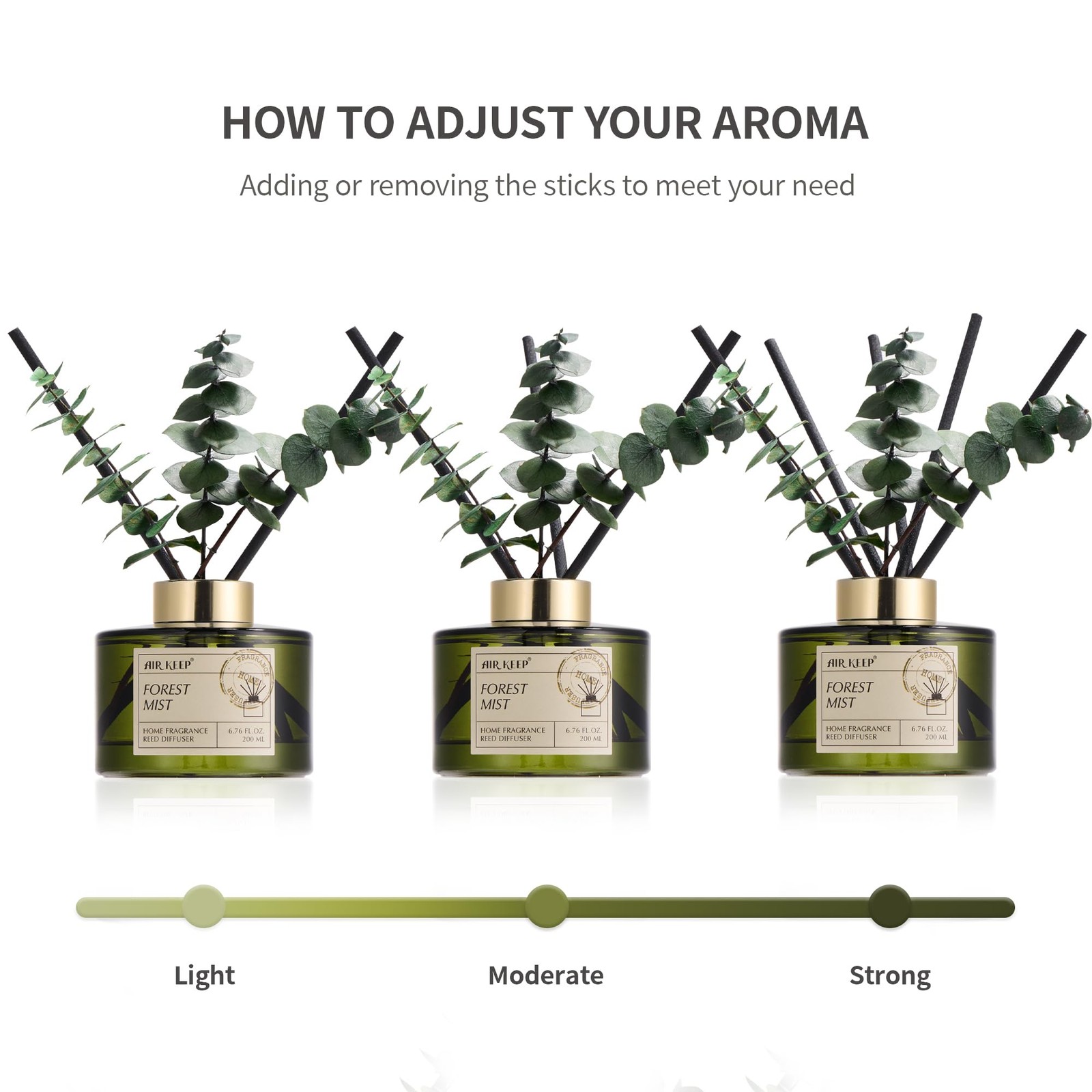 Diffuser Set Contents: 1 bottle of high quality liquid aromatherapy, 5 fiber sticks with high volatility, 3 eucalyptus sticks(enhance and diffuse fragrance) and 1 luxurious and beautiful box