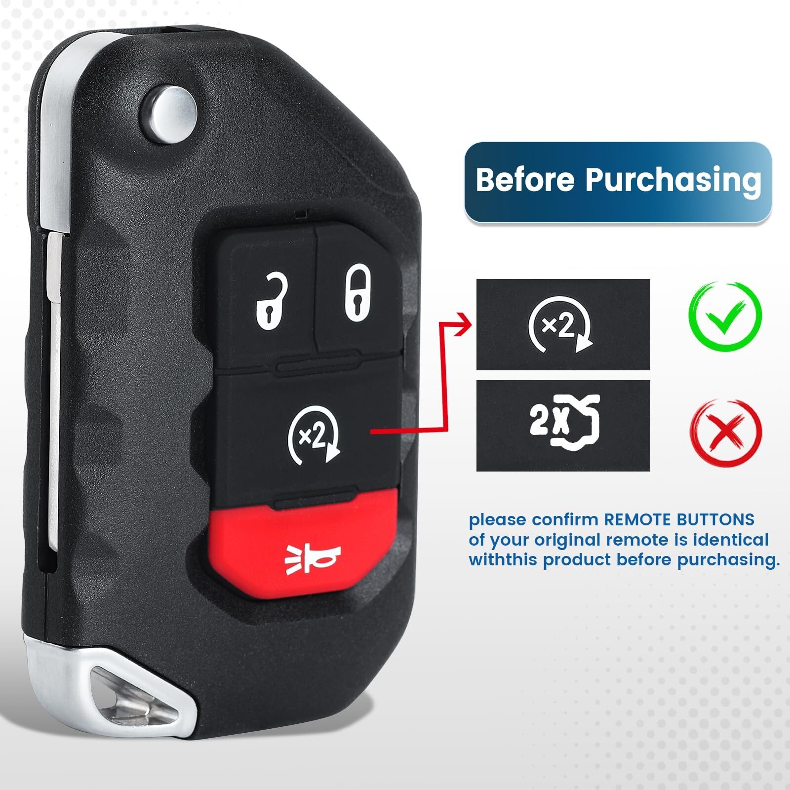 Compatible modelsFits for Jeep Wrangler 2018-2022, for Jeep Gladiator 2020-2022(433MHz PCF7939M/Hitag AES/4A Chip). 4buttons: Lock, Unlock, Remote Start, Panic