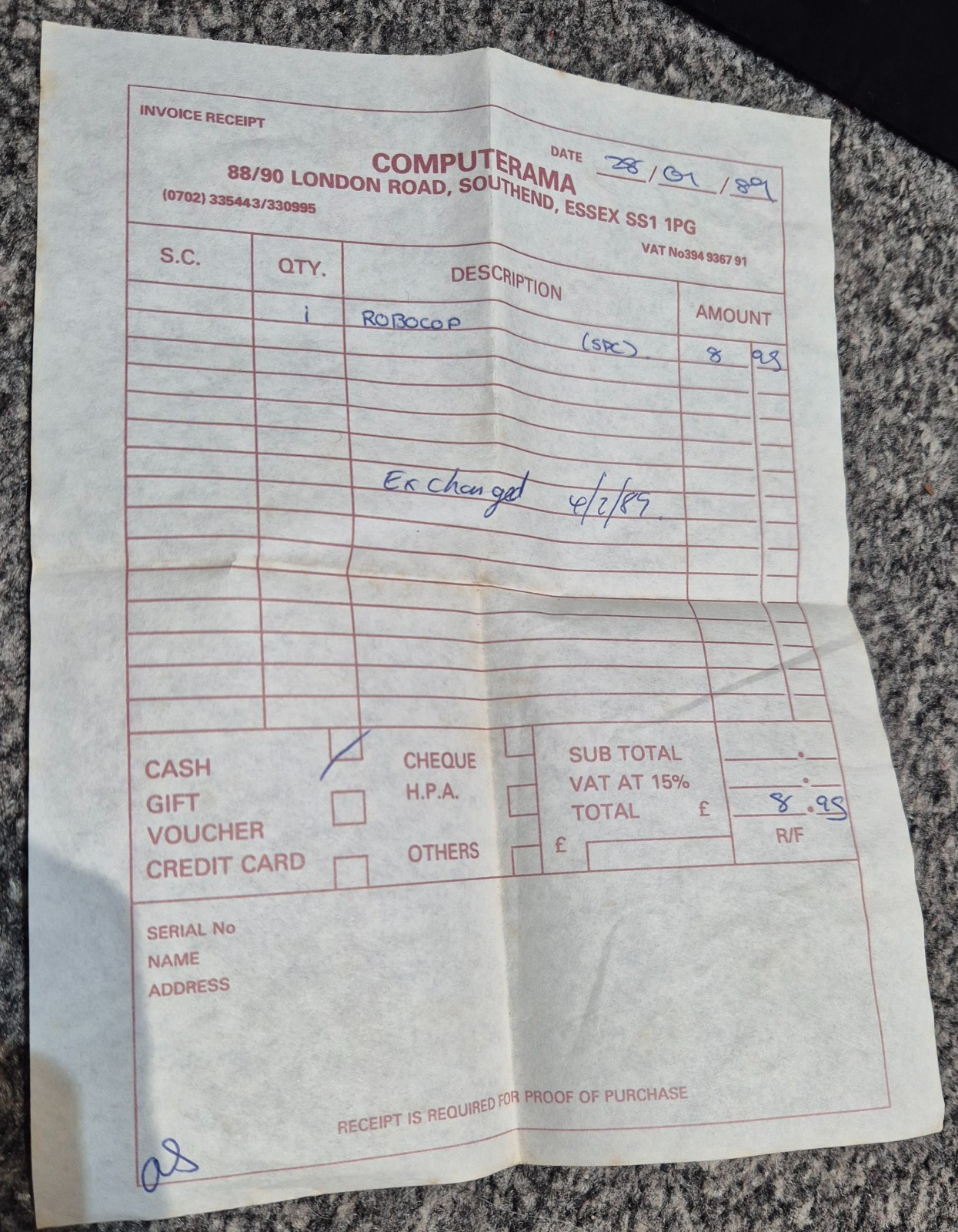 No manual, but does include the original 1989 purchase receipt from Computerama, Southend.