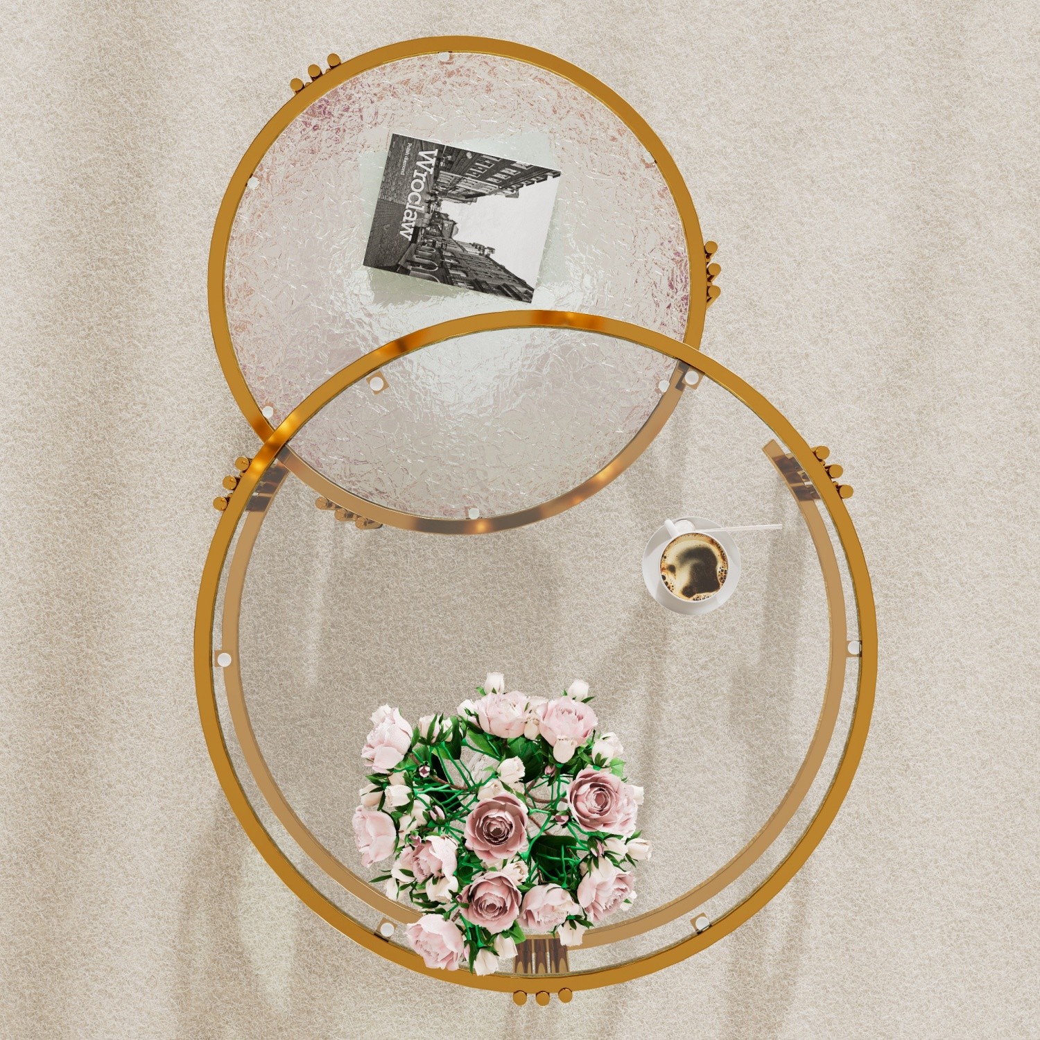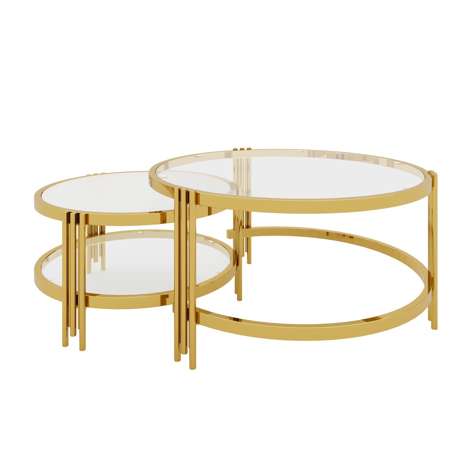 This modern 2-piece coffee table set features coordinated designs with textured glass tops, elegant gold-finished metal frames, sturdy construction, and a versatile glam aesthetic that elevates contemporary living spaces.