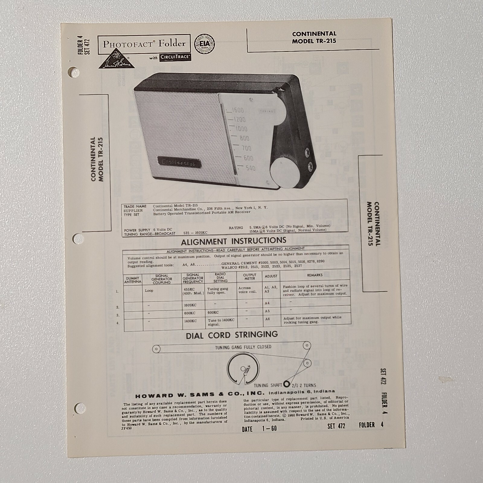 Original Sams Photofact Manual CONTINENTAL TR-215 (472)