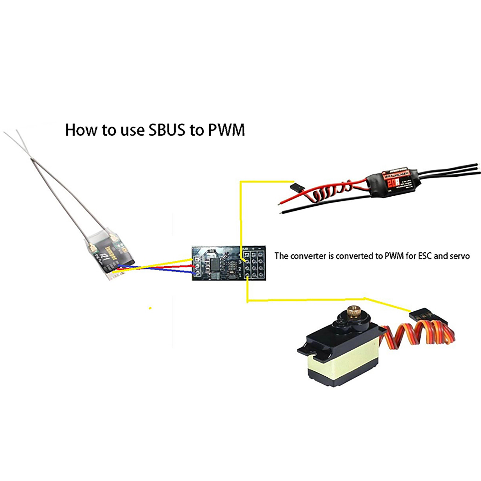 l It is suitable for receivers with SBUS output. The signal can be converted to PWM for servos and ESC. In this way, receivers with SBUS output can also have multiple uses