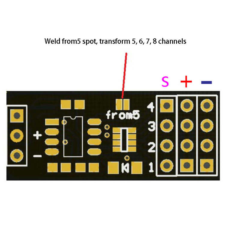 l Output: 4 PWM signals (according to the solder joint selection, whether to output SBUS 1-4 channels or 5-8 channels)