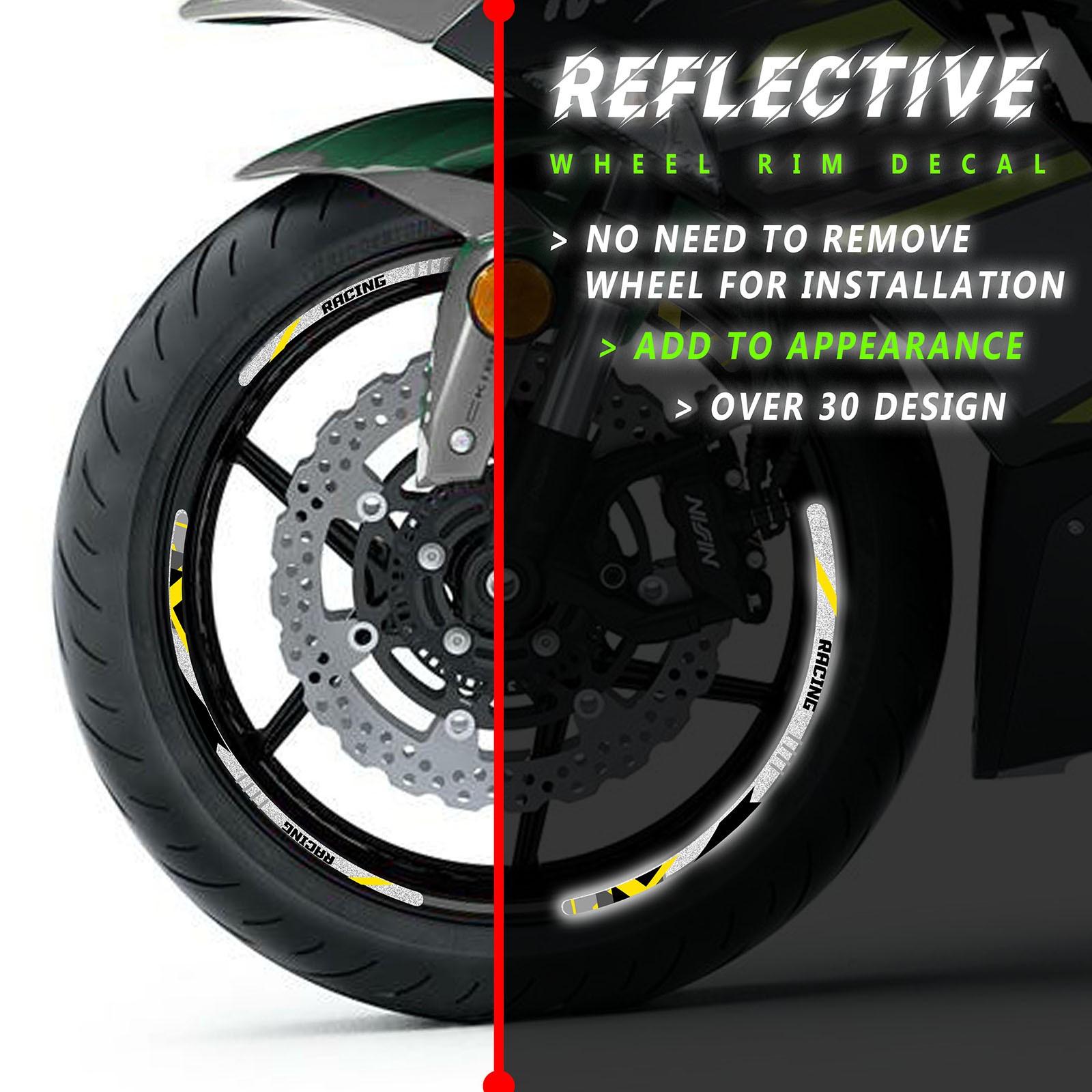 Features: Fit on Motorcycle with 17" wheel rims Made from high quality reflective material Can reflect under light and flash at night and in dark environment Stickers in pre-curved shapes to perfectly fit the shape of your rims. Waterproof Designed to fit different colored rims and wheels No need use heat gun / hair dryer for installation Need to apply on clean and dry rim surface Fitment: Yamaha FJ09 MT-09 Tracer 2018-2020