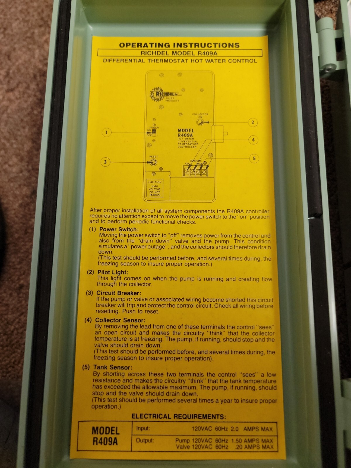 Back in the 1980's this was state of the art technology. Even though it is not today it still does exactly what you need to do for a solar water heater. It detects that the solar collector is hotter than the water heater and turns on a pump to flow the water to the collectors. All you need is sensors which you can buy on eBay. Make sure that this is what you are looking for. It will ship in the box as shown in the auction unless other arrangements are made but shipping will go up. As with all my auctions there are no returns.