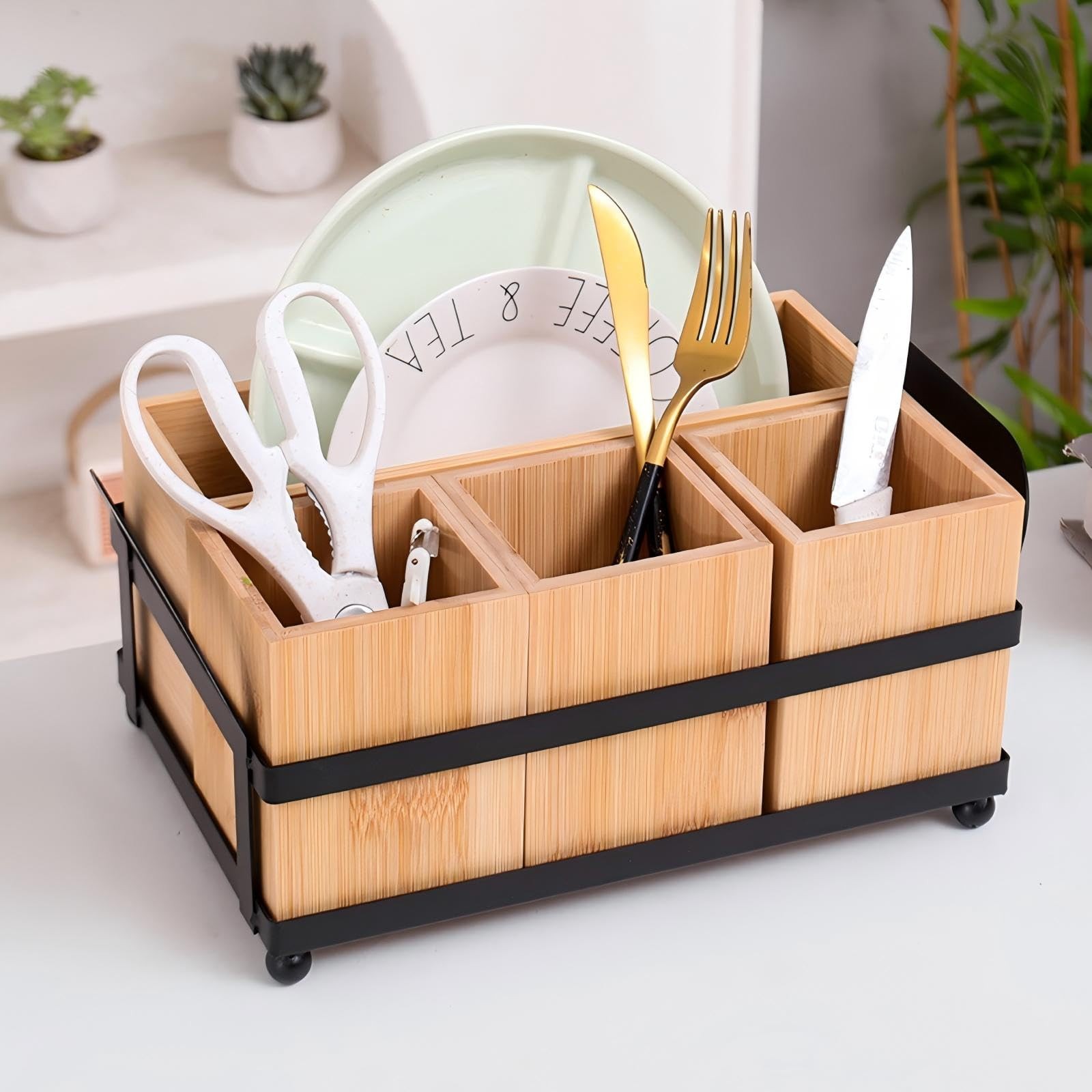 Silverware Holder:The utensil caddy 4 in 1 has four removable square wood slots which can be used to organize 8" paper plates , napkins,spoons, forks, and knives. With the black metal handles,you can be easy to carry it.Durable and easy to move