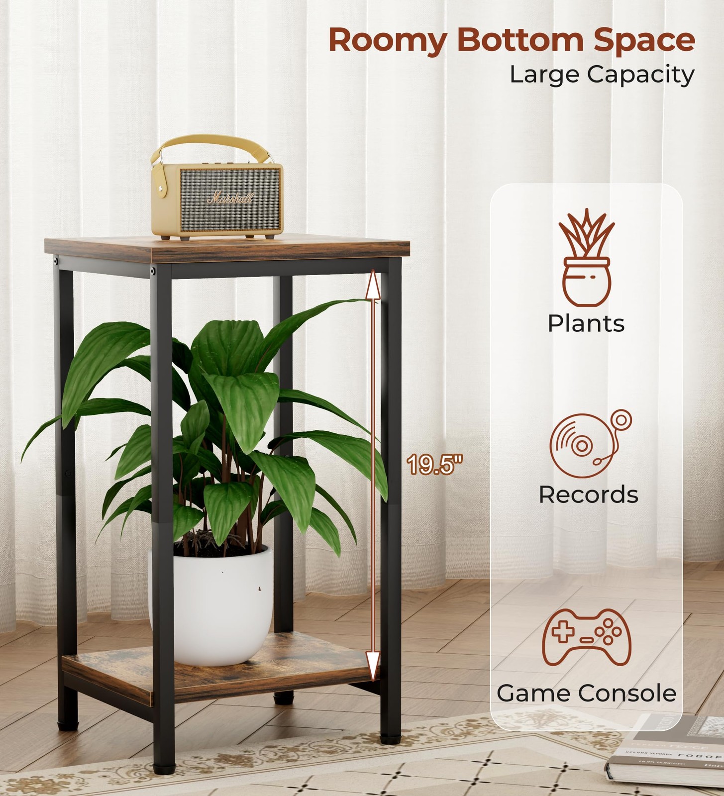 【Tall-Spaced & High-Capacity】This 2 tiers living room side table features generous spacing between strong wooden shelf, offering open storage for books, record albums, tall plants and baskets, keeping everything both secure and stylish