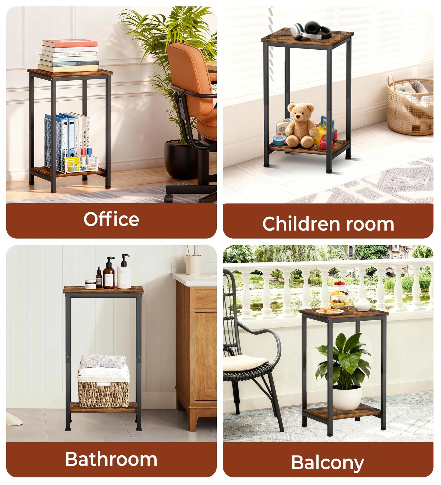 Here is something quietly joyful about finding a home for every little items, this sleek, space-saver 2 tier side table makes it all possible. Standing beside your sofa or close to your bed, it fills those little floor spaces, giving purpose to every inch of your home. The skinny end table has classical appearance and streamlined design, imaging soft morning light falling over the top shelf where your favorite novel and a cup of coffee rest, while below, in the roomy open stoage space of the narrow end table for small spaces, a lush green plant thrives beside that stack of vinyl records you' ve been meaning to display. It’s more than storage, it's also a little corner of happiness. No more cluttered surfaces or frantic searches for the remote. Now, your books, phone, lamp, and even that cozy throw blanket have a designated spot, all within arm' s reach with the slim side tables living room, yet neatly arranged. Everything feels light, organized, and just right. And the best part? The mini side tables for small spaces took you less than 15 minutes to put it all together, no stress. The solid metal frame stands firm and steady. You feel a small spark of pride every time you glance its way. This isn' t just a small table, it' s your new favorite way to bring order, style, and a whole lot of calm into your daily life. Measurement: 13.4"W x 12"D x 22.8"H