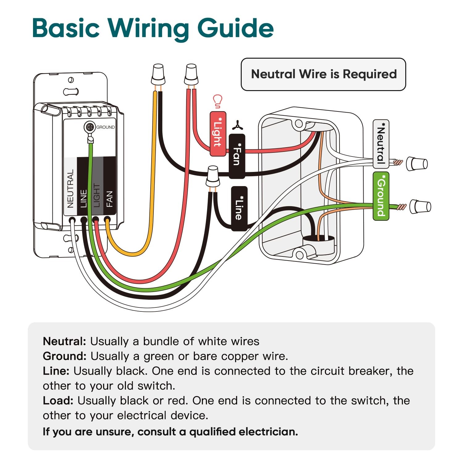 Note: Designed for stable 2.4GHz Wi-Fi connections only (5GHz not supported). No hub required. A neutral wire is required, and a complete wiring setup must be present, including fan load, light load, line, and ground wires. The fan and light must each have their own independent load wire; shared load wiring is not supported. This switch supports single-pole installations only and is not suitable for 3-way or multi-way configurations. Switch dimensions: 4.13" (L) × 1.73" (W) × 1.38" (D)