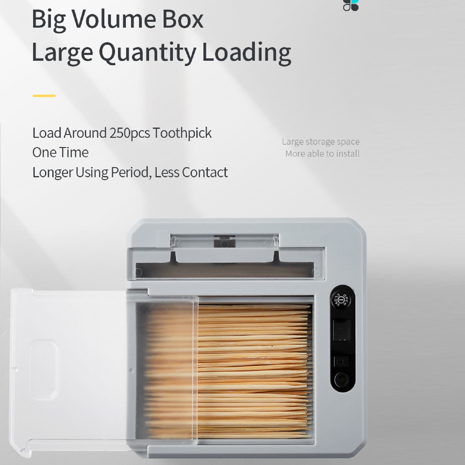 2. The toothpick holder is designed with 120 degrees inclination for quick pickup. The key to reliable dispensing is to not fill the unit up all the way and to leave a little room inside.