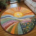 Sunrise Meadow Quilt Round Rug, Floral Landscape Patchwork Boho Floor Mat
