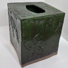 Tissue Box Cover Square Glazed Earthenware Embossed Shiny Green Leaf Pattern