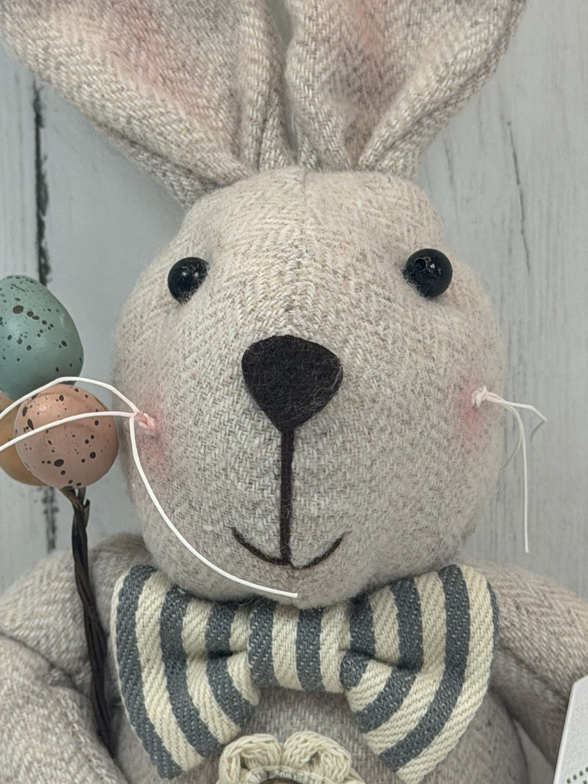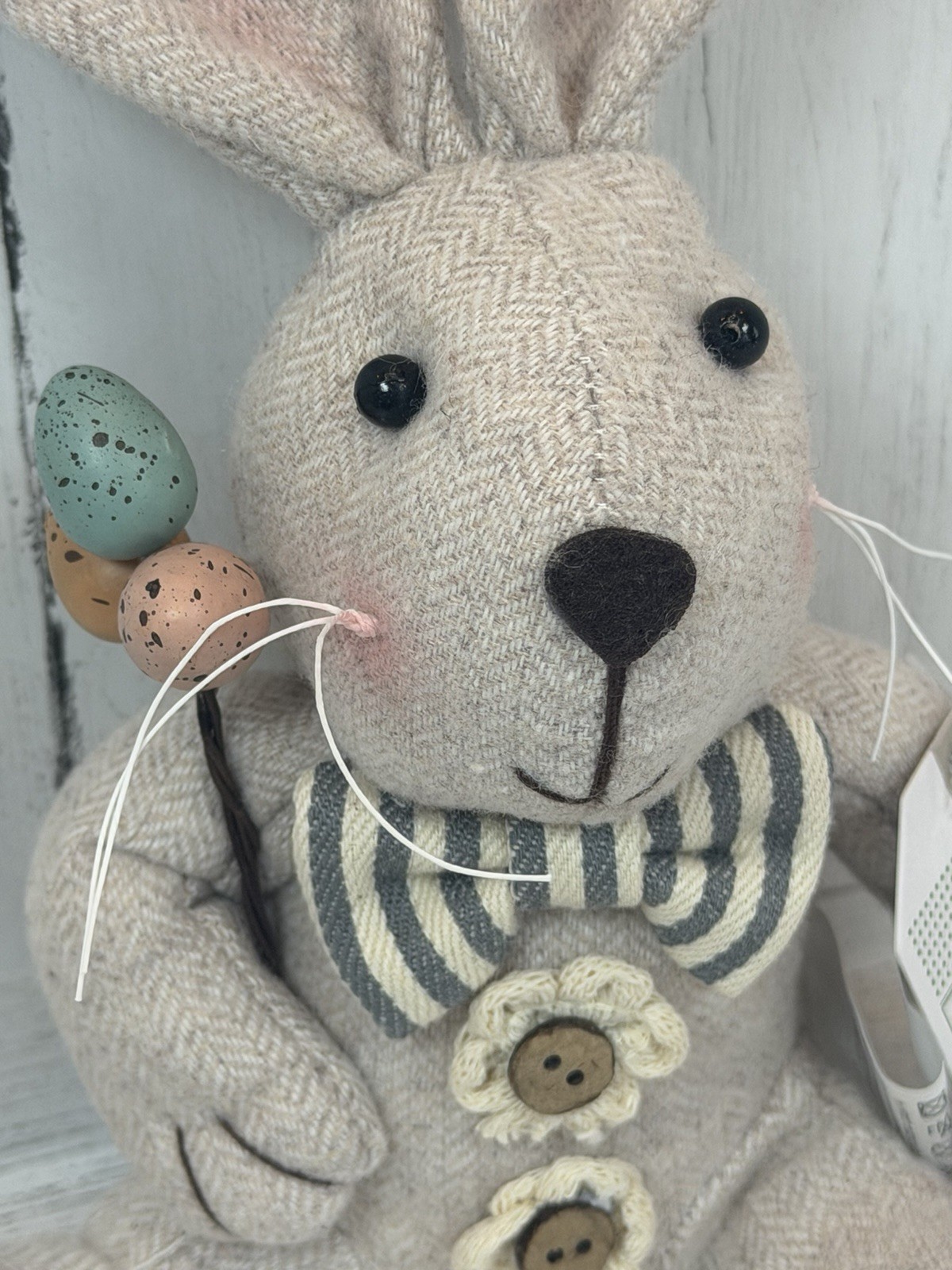 The Spring Bunny Shelf Sitter is a charming burlap figurine perfect for Easter decor. This adorable bunny figure from the brand Spring adds a touch of whimsy to your home during the holiday season. The burlap material gives it a rustic and natural look, fitting in perfectly with any Spring or Easter-themed decorations you may already have in place. Ideal for display on a shelf or tabletop, this figurine is a lovely addition to your holiday decor collection.