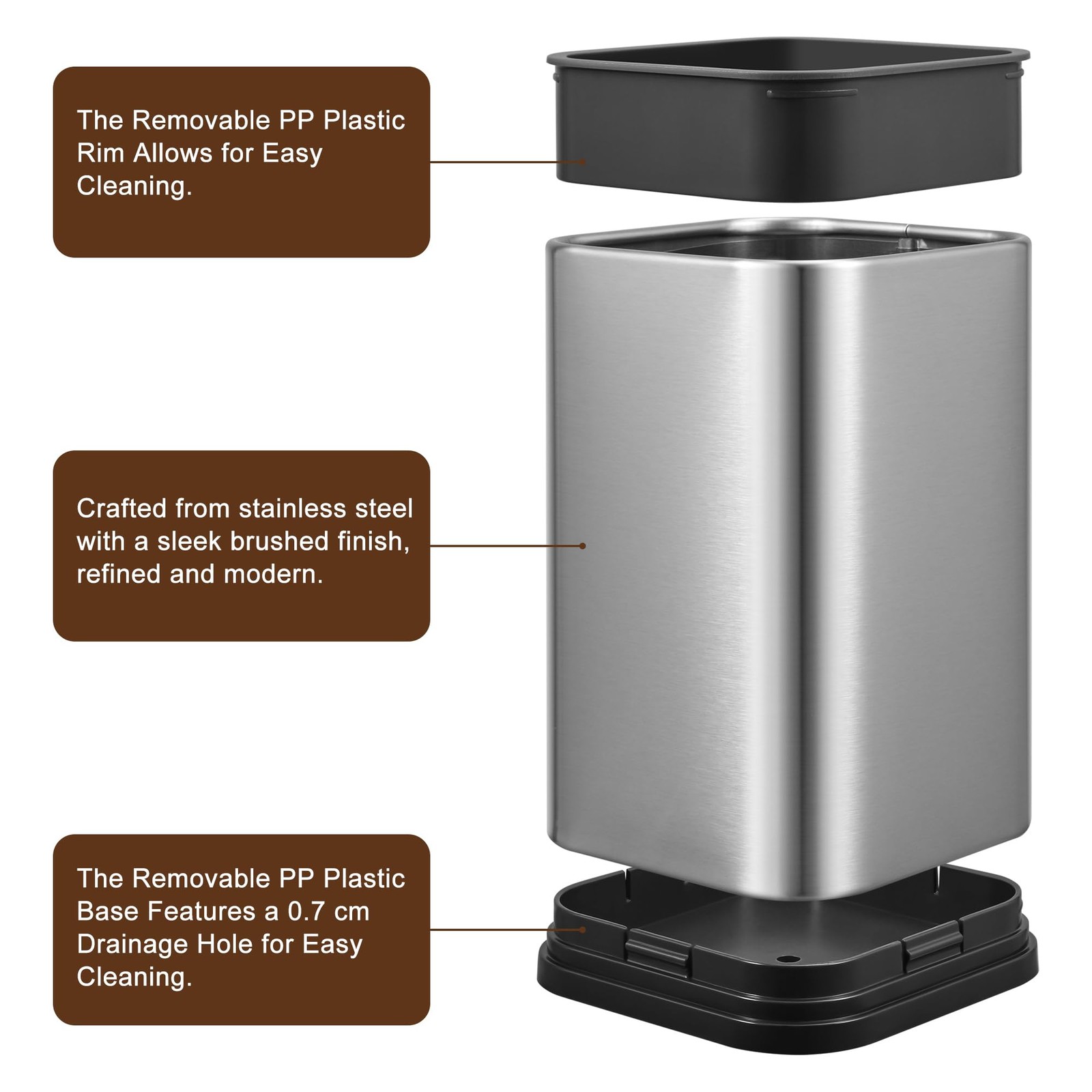 - (5) Product Features: The stainless steel body is durable and rust-resistant. The embedded plastic rim and base are made of wear-resistant polypropylene and can be removed for easy cleaning. The base features drainage holes for convenient water drainage.
