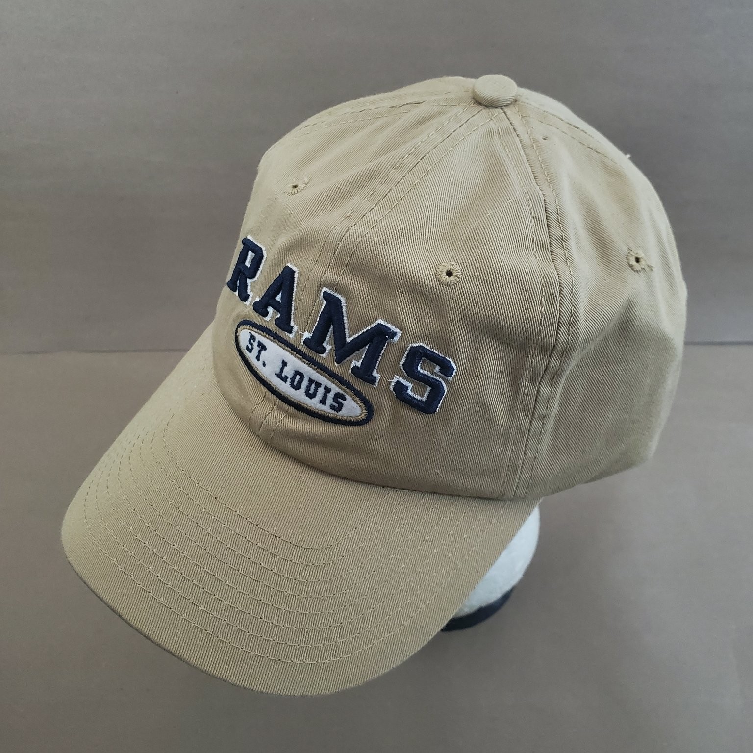 Show your support for the St. Louis Rams with this classic Reebok baseball cap. Crafted in a versatile khaki tan colorway, this adjustable hat features prominent navy blue and white embroidery of "RAMS" and "ST. LOUIS" on the front, showcasing your team pride. The cap's design is completed with a subtle yet distinctive St. Louis Rams logo embroidered on the back, making it a must-have for any fan or collector.
